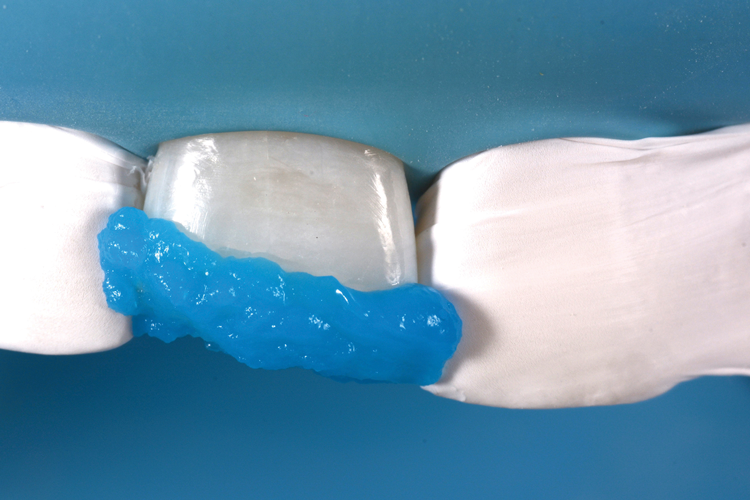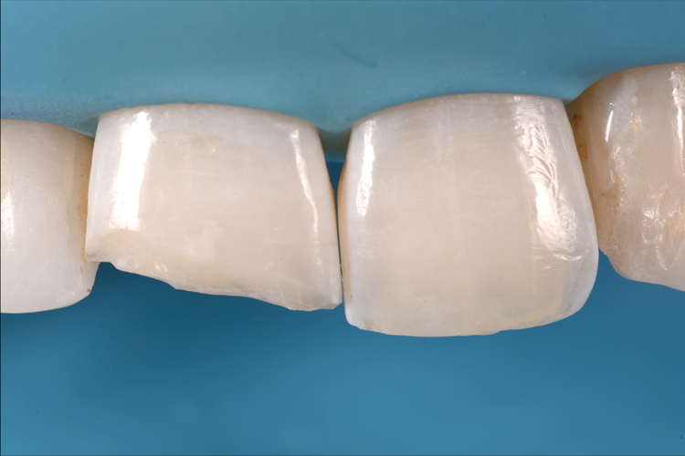 In anterior teeth, the risk of postoperative sensitivity is lower, and the enamel quantity is generally higher. For these reasons, clinicians should consider following an etch-and-rinse approach to obtain higher bond values. This second case report describes a Class IV restoration treated with a universal adhesive applied in etch-and-rinse mode. The patient presented to the office complaining about the esthetic appearance of tooth No. 8, which had a restoration that was performed 5 years earlier after a traumatic accident (Figure 6). The tooth still demonstrated vitality; therefore, the placement of another direct restoration was proposed and accepted by the patient. First, the previous restoration was removed, and the margin was prepared with a chamfer design (Figure 7). After adhesive procedures were performed with a universal adhesive applied in etch-and-rinse mode (Figure 8), the tooth was restored with composite materials in appropriate opaque and translucent shades with the help of a silicone index and sectional matrices (Figure 9 and Figure 10).