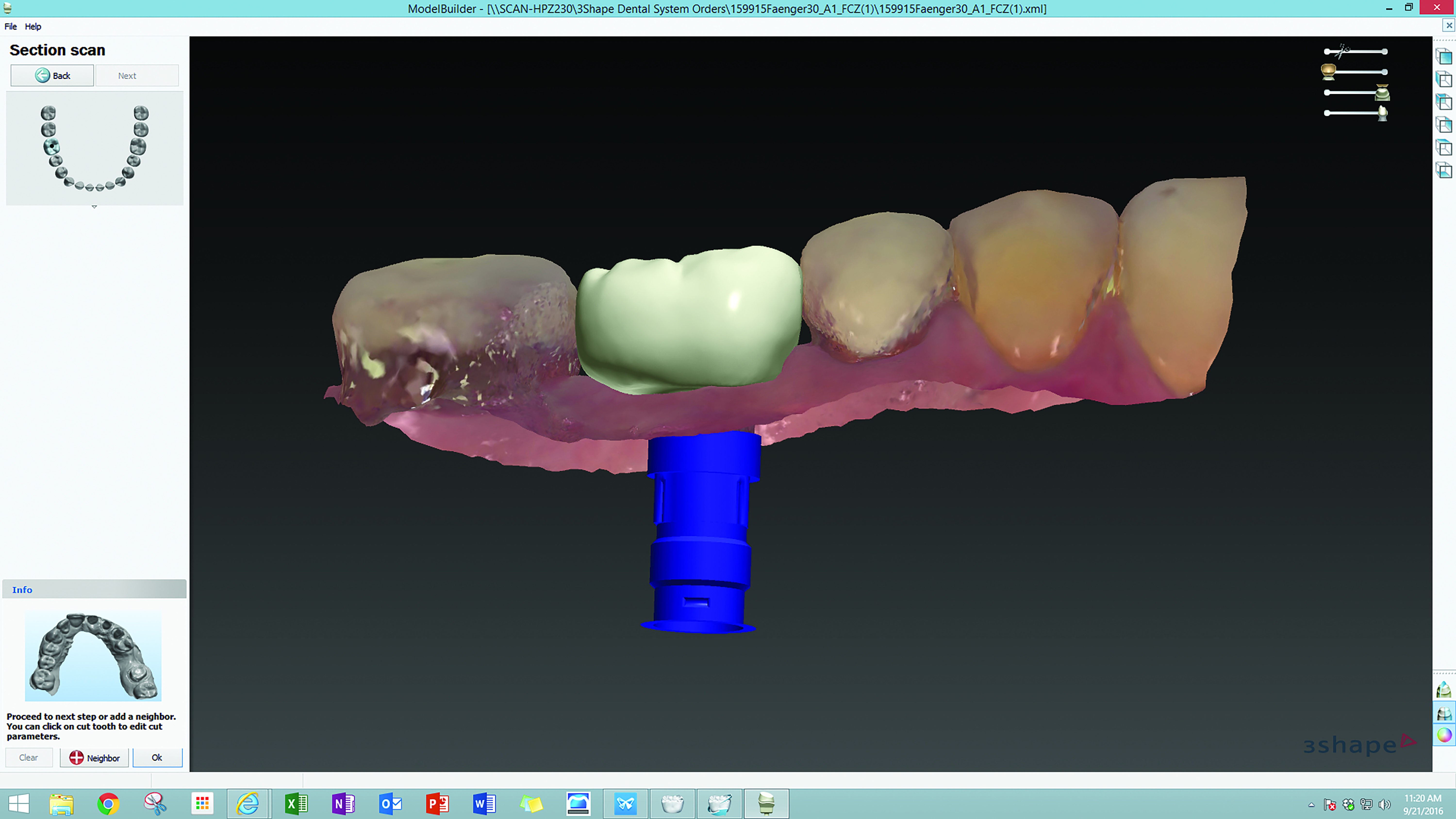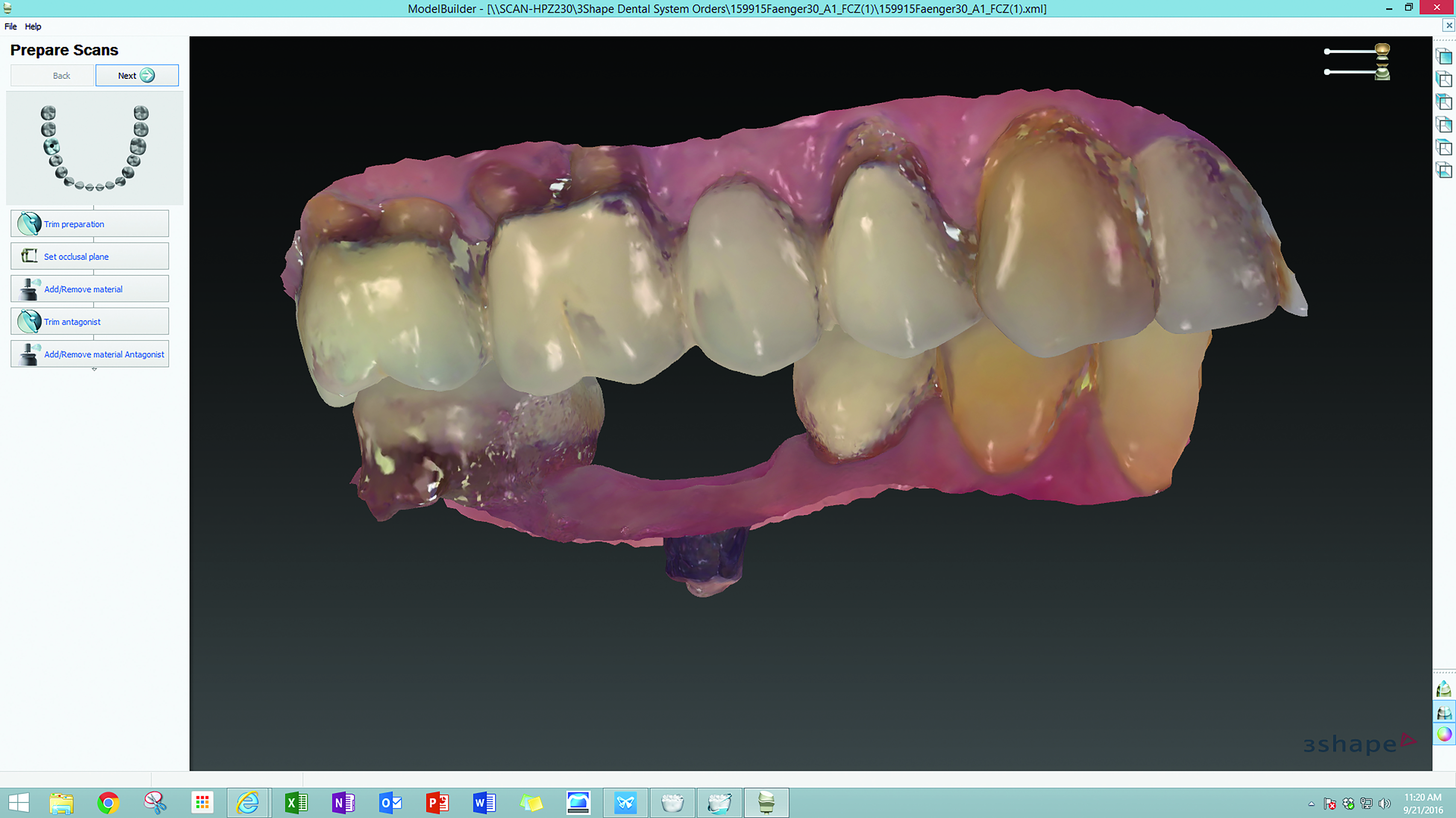 A central concept to intraoral scanning in the dental operatory is the provision of quicker input for the prosthesis workflow without the use of conventional dental processes and materials. By capturing the data via an intraoral device, the workflow can start immediately in the dental laboratory once the STL file is sent via a HIPPA-compliant Internet connection. If a “complete CAD/CAM product” is desired, then design, milling, and production of a prosthesis can take place within a couple of minutes. The rapidity with which restorations can be manufactured has a bearing on the patient experience in implant dentistry. By achieving “sooner to teeth solutions” the interdisciplinary team can reduce the time the patient experiences an edentulous site while providing predictable outcomes.
