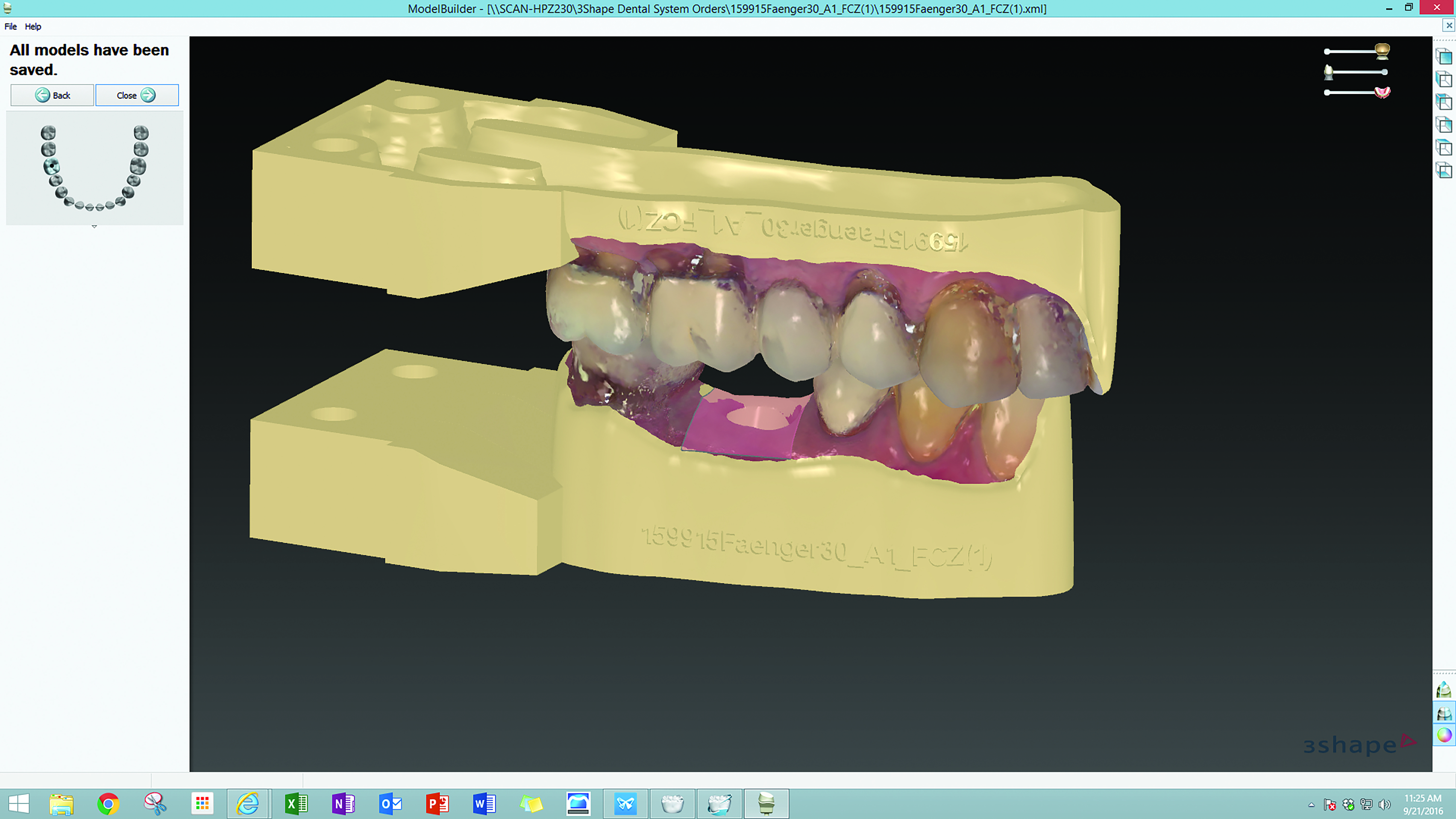 The design software enables the technician to open an STL file and design implant prosthetic components, ie, custom abutments and cement- and screw-retained crowns. Additional applications for open STL files include orthodontic aligners, occlusal guards, surgical guides, digital articulation, and digitally printed models. The laboratory technician can elect to use an all-digital workflow or a partially digital workflow with the fabrication of a 3-dimensional (3D)-printed stereolithographic model. Examples of commercially available open architecture STL systems are iTero® (Align Technology, itero.com), True Definition (3M ESPE, 3m.com), PlanScan® (Planmeca CAD/CAM, planmecausa.com), CS 3500 (Carestream Dental, carestreamdental.com), TRIOS® (3Shape), and Aadva™ IOS (GC America, gcamerica.com).