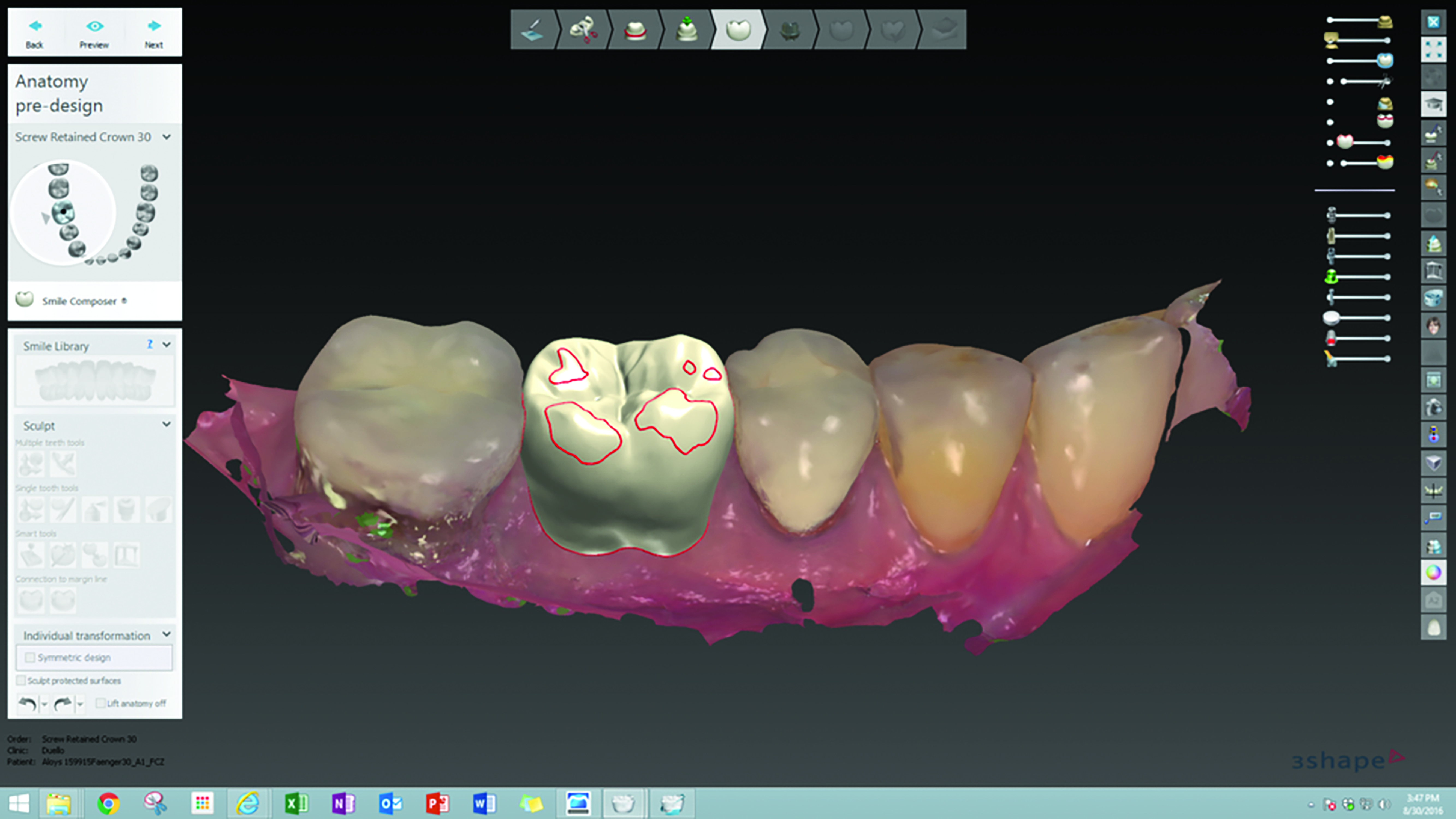 Once the STL file generated from the intraoral scanner was sent to the laboratory (Figure 5), the technician used proprietary software to design the crown (Figure 6 through Figure 8), mill the crown, and digitally print a SLA model (Dental SG, Formlabs, www.formlabs.com) (Figure 9 through Figure 11), and then finish the crown on the digitally printed model. The angulated screw-channel full-zirconia crown (Nobel Biocare) (Figure 12) was seated, and contacts were evaluated intraorally and adjusted extraorally. The screw-retained crown was torqued to 35 Ncm2, and the screw access was sealed (Figure 13 through Figure 15).