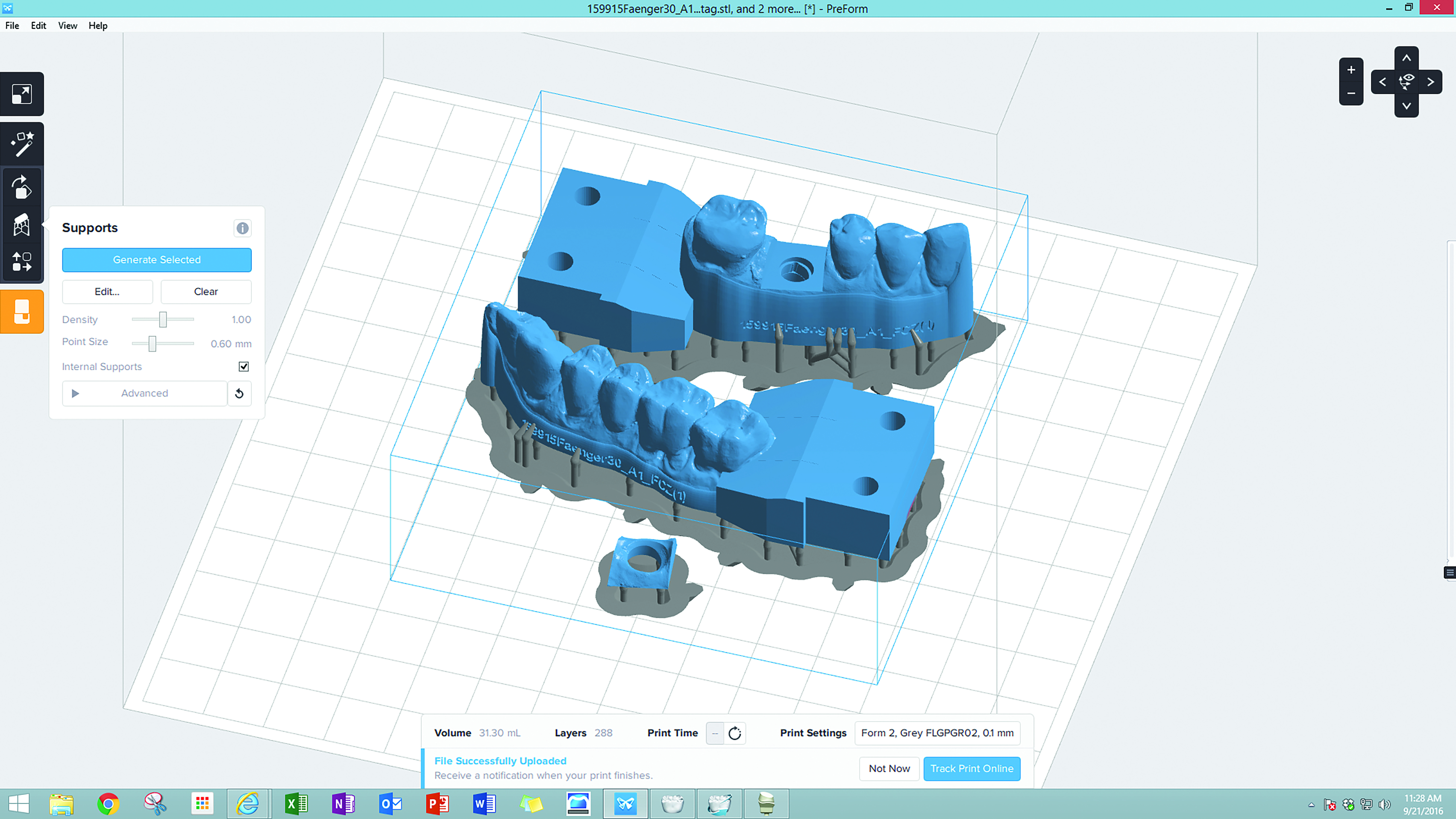 Additional upfront costs for this protocol include an in-office mill, design software, dust extractor, upgraded dental compressor, dental furnace, and CAD/CAM polyceramic monolithic blocks (including a complete inventory of all shades in the shade guide) for milling. Different materials require more or less milling time in the in-office milling device, depending on the material chosen for the patient. In some cases, long-term provisional restorations or custom healing abutments may be milled out of polymethyl methacrylate (PMMA) blocks. With the advent of affordable desktop 3D printers, some dentists are fabricating models or implant surgical guides in the office for diagnosis and implant surgical placement with fully or partially guided drilling protocols.