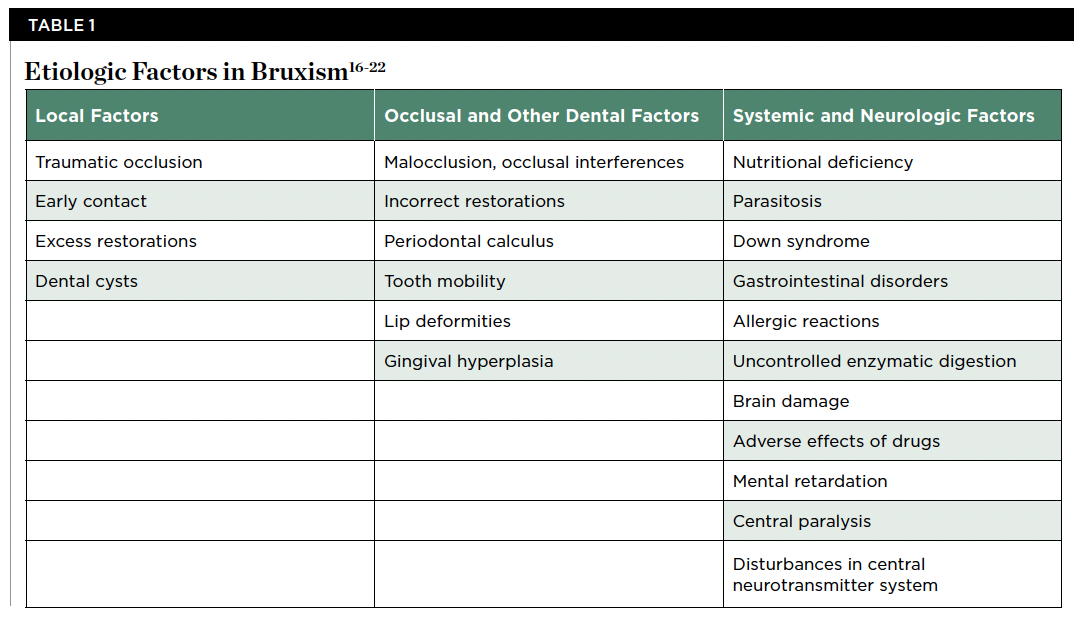 Bruxism is generally accepted to have multiple causes, including psychosocial factors such as anxiety, pathophysiological factors that involve neurotransmitters or the basal ganglia, occlusal interferences, as well as several local, systemic, and other factors (Table 1).16-22Anxiety and emotional stress are believed to be the most common triggers in patients with awake bruxism.11,19 Malocclusion is also believed to be a possible pre- disposing factor of bruxism.11 Occlusal interferences are one of the most probable causes of bruxism and eccentric occlusion,20with eccentric occlusion resulting in premature contact of teeth. According to a study by Safari et al, evaluation of occlusal contacts in patients with bruxism can be useful in the assessment of causative factors.20