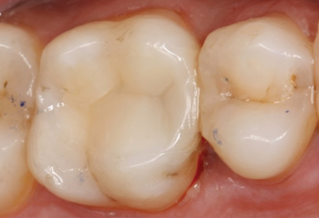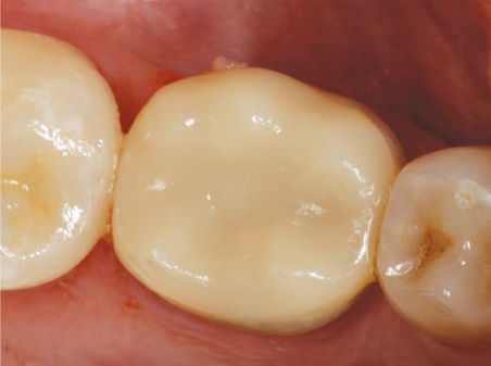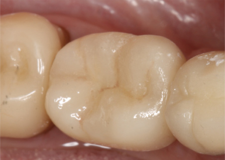 Figure 6 displays a case with a two-surface inlay on an upper first molar. After a failing amalgam restoration was cleaned up and the tooth was prepared for the two-surface inlay design, the clinician used a hybrid material to mill the restoration. Because the hybrid material blends more effectively into the surrounding tooth structure2 when bonded, the cavosurface margin between the restoration and tooth surface is mostly hidden.