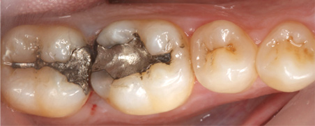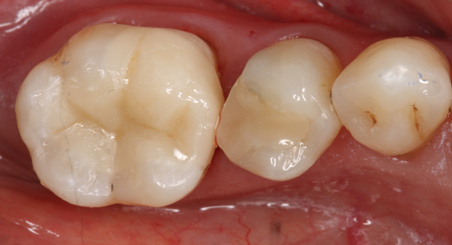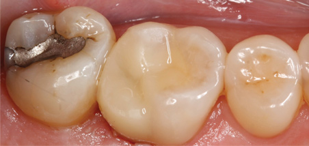 In another case involving a failing amalgam restoration (ie, tooth No. 30), there was still some healthy tooth structure present on the mesial surface (Figure 11). The tooth was prepared, and an onlay was planned and placed (Figure 12 through Figure 14). Some occlusal cavosurface margin was visible. It is clear from these images that, beyond choosing an appropriate restorative material, performing a small amount of staining and glazing enabled the clinician to blend the restoration with the neighboring teeth. Therefore, the final recommendation for posterior CAD/CAM restorations is that subtle staining can greatly enhance the esthetics of outcomes.6