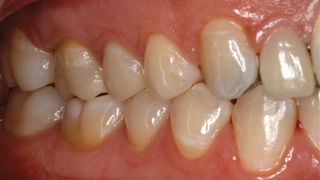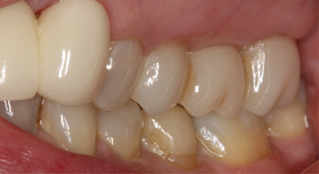 Figure 10 depicts a crown that was placed on tooth No. 4. Preoperatively, an existing silver amalgam filling with recurrent decay had been visible, so the decision was made to convert it to a crown. The clinician used some staining and glazing to help mimic the neighboring teeth. The aforementioned case in Figure 5 also provides an example of the power of staining, demonstrating how a bridge can be made to look more like individual teeth using stains placed between the connectors.