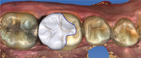In a similar case involving an onlay (Figure 3 and Figure 4), the clinician scribed anatomy that resulted in the appearance of natural stains. Figure 3 shows the scan that was taken being displayed on a CAD/CAM system; Figure 4 shows the final restoration bonded into place.