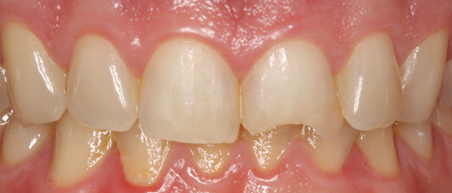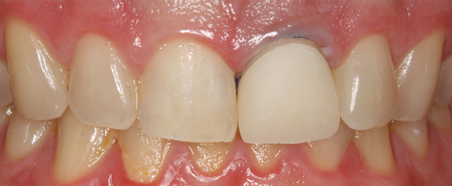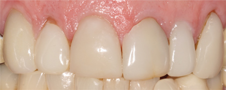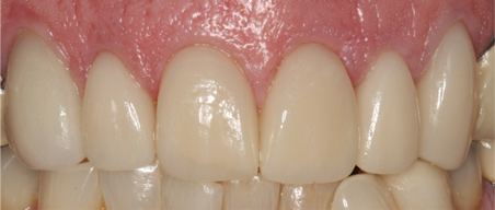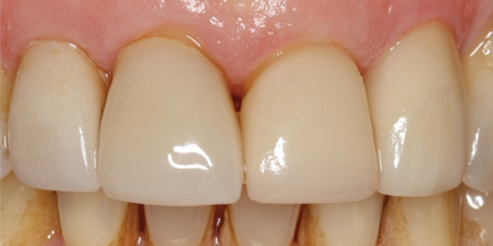 A second recommendation for anterior restorations relates to the cases shown in Figure 17 and Figure 18. In both cases, the clinician restored teeth Nos. 8 and 9. For the case in Figure 17, veneers were placed; for the case in Figure 18, crowns were placed. The case depicted in Figure 18 looks better esthetically because the centrals in Figure 17 are not symmetrical. For the case in Figure 18, tooth No. 8 was somewhat overlapped onto tooth No. 9, which lead to a perfectly symmetrical result. When working on anterior teeth, it is important to make the centrals symmetrical.8,9 With a straight midline and symmetrical centrals, the case in Figure 18 looks more esthetically pleasing when compared to a case with a canted midline and asymmetrical centrals. Because the centrals are symmetrical, other less than optimal aspects of the case are less noticeable. For example, the gingival zenith of tooth No. 11 was pointier than that of tooth No. 6, and the width of tooth No. 7 was greater than that of tooth No. 8. These discrepancies are less integral in the presence of a straight midline and symmetrical centrals.
