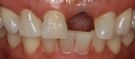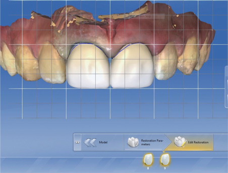 This mistake can be avoided. Figure 21 presents a similar case in which the patient had a skiing accident and needed root canals for teeth Nos. 8 and 9. When the clinician was designing the restorations with the CAD/CAM system, an initial scan of the teeth was taken, which showed the original position of the gingiva prior to any reduction of the teeth or cord packing. The clinician prepared both teeth for crowns and finished the design (Figure 22). Looking carefully, an open black triangle can be seen between teeth Nos. 8 and 9. When designing this case, some dentists or assistants might want to close the gap by adding porcelain, but ultimately, that would be detrimental because it would create a disproportionate contact length.12