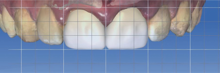 For anterior restorations, the midline is critical. Figure 15 and Figure 16 show two different cases in which tooth No. 9 was restored. For the case in Figure 15, the clinician placed a veneer on tooth No. 9. For the case in Figure 16, the clinician converted a large composite filling, which was staining and chipping, into a veneer. In Figure 15, the midline is canted, whereas in Figure 16, the midline is straight, making it look more natural by comparison. With anterior restorations, it is very important to avoid creating a canted midline.7 The most important recommendation is to pay attention to the midline's straightness. Within a CAD/CAM system, using a grid while treatment planning can help clinicians set the midline straight.