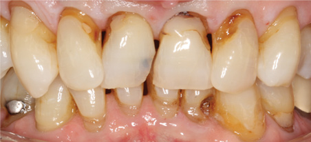 A 93-year-old patient was unhappy with the appearance of his teeth and insisted that something be done about them on the same day as his recall examination (Figure 24). Among his maxillary and mandibular incisors, there was some recurrent decay, failing composite fillings, and the presence of overlaps. This type of case usually necessitates that a wax-up from the laboratory be transferred into the mouth for patient approval, but this patient was in a hurry. The clinician agreed to have the teeth prepared in the morning and then delivered in the evening. The restorations were designed using a grid to make them as symmetrical as possible. When the restorations were milled, there was a shade change between the gingival third and the incisal third, but the change was not enough to mimic the patient's surrounding natural teeth. Consequently, the clinician had to perform extensive staining. Four stains were used, including dark orange on the gumline, which transitioned to yellow and beige on the body of the restoration. Figure 25 shows the final postoperative image. Due to recession, the patient's teeth appeared longer, and there were also some dark areas around the gumline. Using the different stains enabled the clinician to mimic the shade variation in the patient's natural teeth. Oftentimes, a custom staining job is necessary to achieve acceptable esthetics in anterior CAD/CAM restorations.