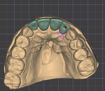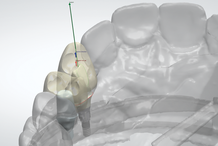 (6.) View of the digital design showing how an angulated screw channel provides a more functionally and esthetically ideal position for the screw access.