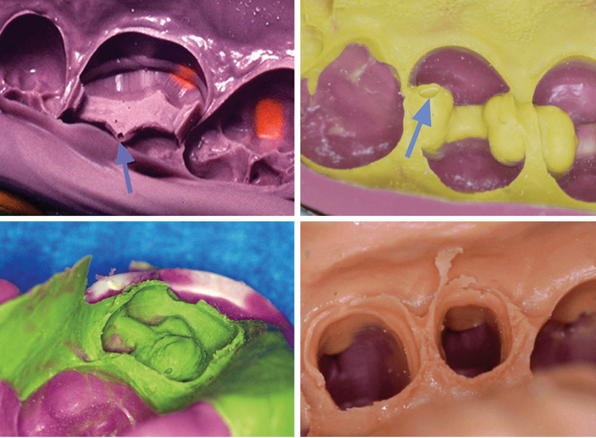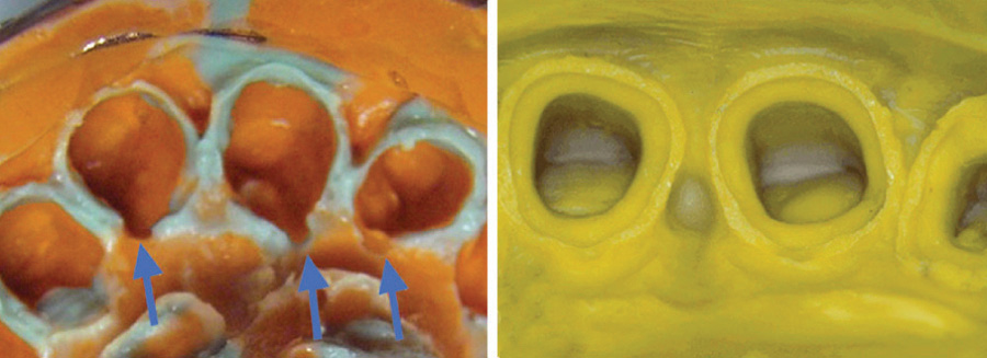 • Issues with the impression material. Most impression materials available today require the clinician to select from various viscosities and to mix the material in a timely manner to create the proper consistency. Errors in mixing are common, leading to improper setting of the material, bubbles, marginal tearing, and other issues (Figure 1).