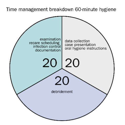 Using the 20-20-20 minute module, the 60-minute dental hygiene appointment can be broken down as follows: 20 minutes for data collection, case presentation, and oral hygiene instructions; 20 minutes for debridement; and 20 minutes for examination, appointment scheduling, and infection control (Figure 1). For the dental hygienist who is employing conventional instrumentation for cleaning, it is difficult to increase the time spent on data collection with this model, especially when faced with more complex cases.