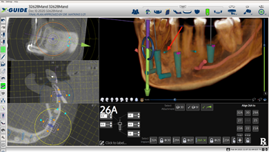 The position of the implants must be prosthetically driven. Any of the major software planning tools can be used with dynamic navi- gation. The software included with the navigation system allows for dual scan planning, as dual scan images are suitable for this prosthetically driven approach. Once the plan is completed, the data should be sent for fabrication of the provisionals. If navigation software is used for implant planning, the data can be exported as individual or linked generic .stl files, or if planning is done without the navigation software, the data can be imported into the navigation system.