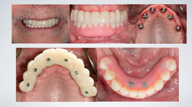 Figure 26 shows a full-arch classic "All-on-X" case at presentation. The patient was a 66-year-old male with a mutilated dentition. The patient had lost vertical dimension and desired a fixed restoration. Options were discussed with the patient, including dentures, which the patient refused long term. The patient instead agreed to a plan to undergo extractions of his remaining dentition and have an immediate maxillary denture with five mandibular implants and an immediate mandibular hybrid denture. The practitioner worked with a laboratory that could provide a monolithic PMMA digitally milled denture. Two months following implant treatment of the mandibular arch, the patient had six maxillary implants placed with immediate denture conversion.