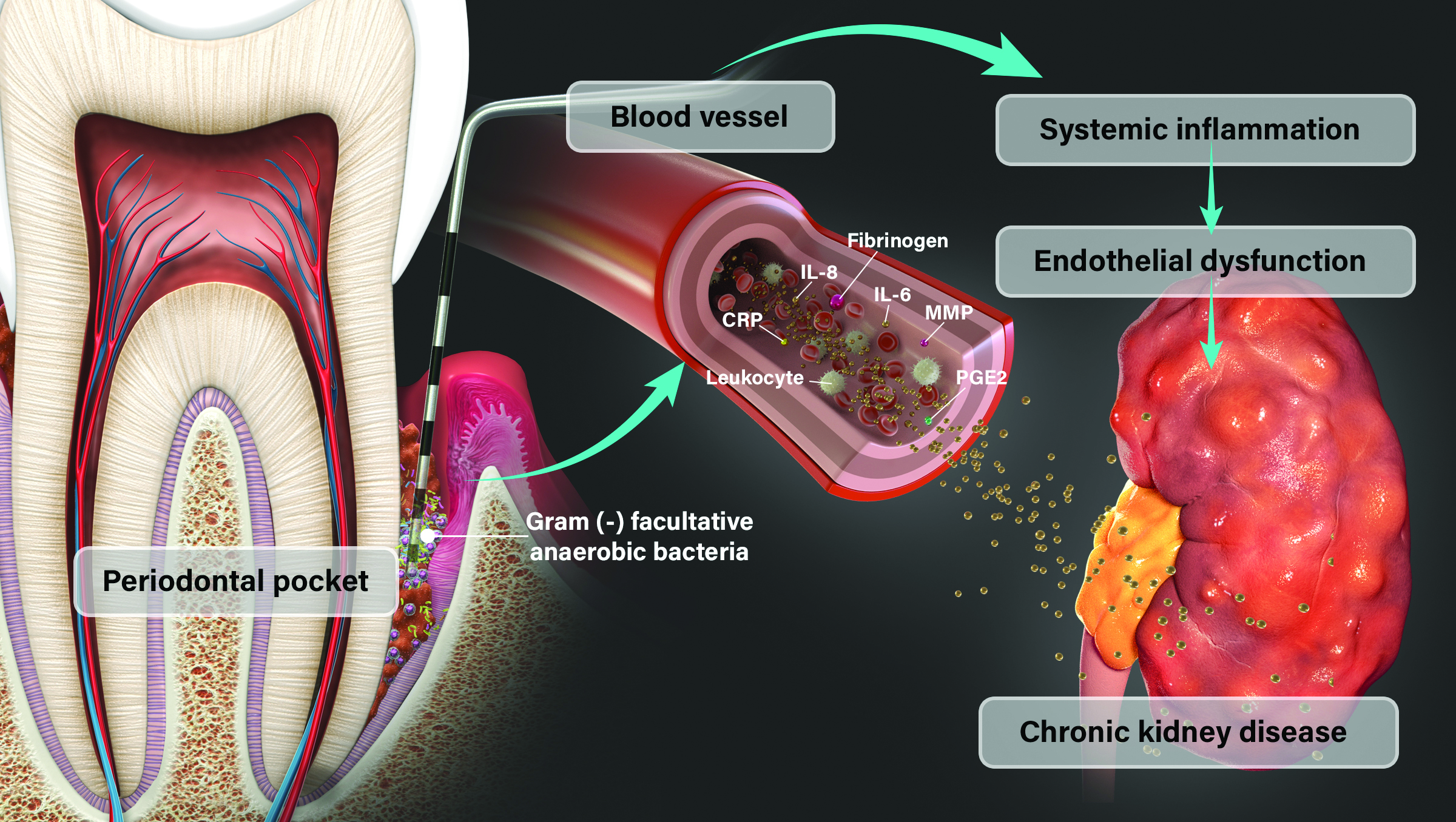 Periodontitis and CKD are associated with common comorbidities. Research has demonstrated significant associations between periodontitis and systemic conditions, including cardiovascular disease, diabetes mellitus, osteoarthritis, and metabolic syndrome, among others, all of which also share a link with CKD.3,8,9,10 This overlapping association makes it challenging to ascertain the extent to which the progression of periodontitis or CKD is either a driver or a result of systemic inflammation, or how much of this inflammation is caused by other underlying conditions.