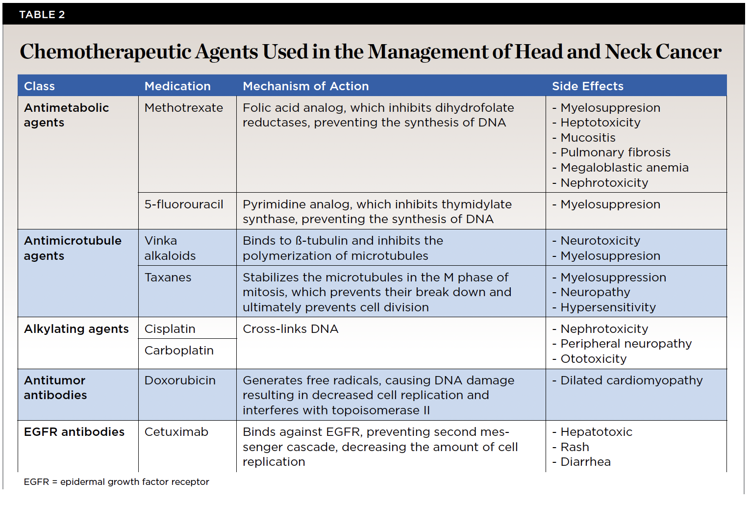 Chemotherapy works by interfering with cell division at various stages. This mechanism of action is beneficial, as malignant neoplasms have uncontrolled cell division and chemotherapeutic medications can interfere with the growth of the tumor. Chemotherapeutic agents that are used in the treatment of head and neck cancer include antimetabolic agents, alkylating agents, antimicrotubule agents, antitumor antibodies, and epidermal growth factor receptor (EGFR) antibodies (Table 2).18