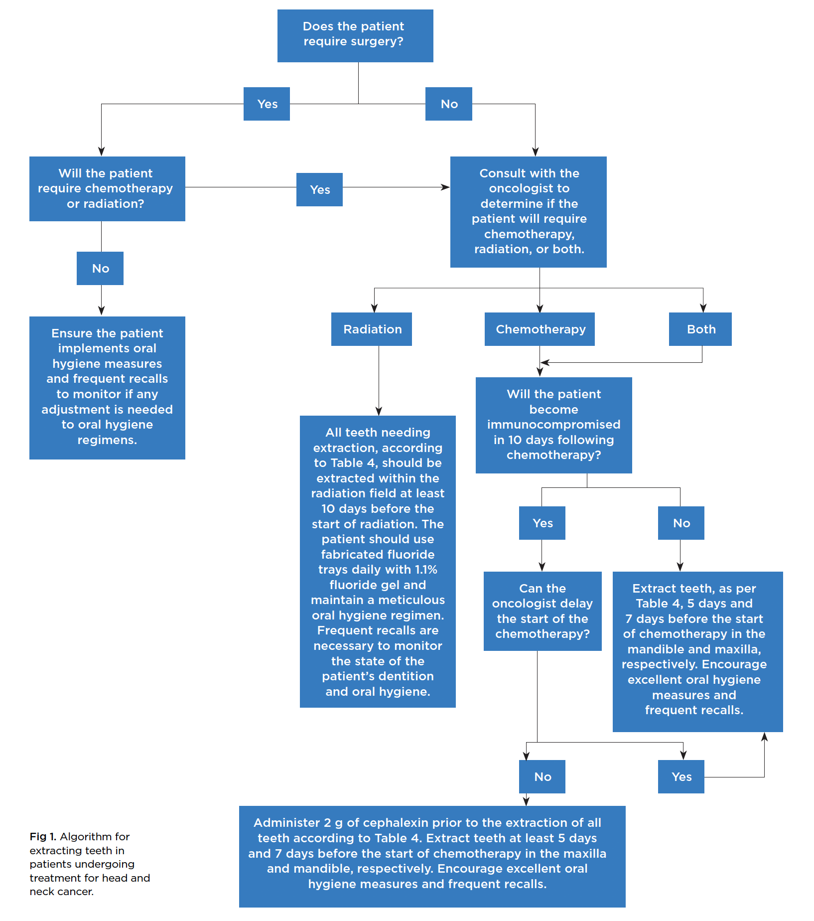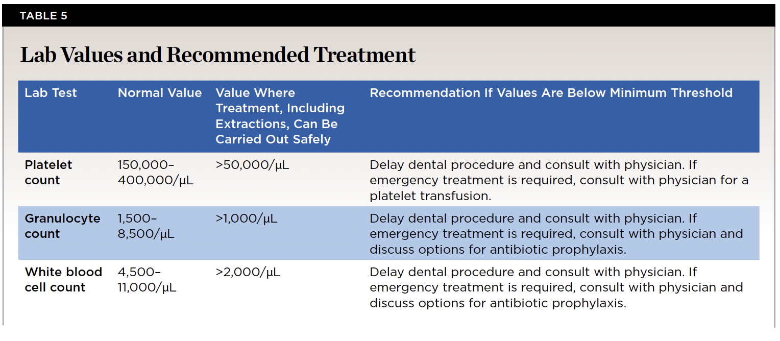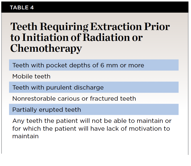 Prior to any cancer treatment, the dental clinician should thoroughly evaluate all head and neck structures. A detailed intraoral examination should be taken with appropriate radiographs, including bitewing, periapical, and panoramic images. Teeth that are nonrestorable, periodontally compromised, or have active inflammatory conditions should be extracted before the start of radiation therapy or chemotherapy. The goal for prophylactic extraction is to prevent the development of osteoradionecrosis in patients undergoing radiotherapy. However, prophylactic extractions should only be executed in areas of the jaws that will be irradiated. The threshold for prophylactic extraction is 60 Gy in the maxilla and 50 Gy in the mandible.31 Patients who are undergoing chemotherapy may develop issues with hemostasis and wound healing, which can complicate extractions. If a patient is expected to become severely immunocompromised (ie, white blood count below 2,000/µL or granulocyte count below 1,000/µL) within the following 10 days, extraction should be delayed or antibiotic prophylaxis with cephalosporins should be given.27 Teeth should be extracted at least 10 days prior to radiation and 5 and 7 days in the maxilla and mandible, respectively, prior to chemotherapy (Table 4).27 Table 5 provides a summary of threshold lab values where extractions can be safely performed and what measures should be taken if the values are below the minimum threshold. Furthermore, Figure 1 shows an algorithm with regard to proceeding with extractions in patients undergoing therapy for head and neck cancer.