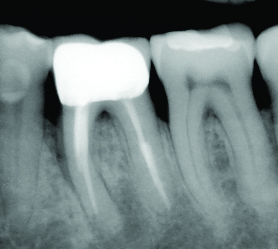 A patient's overall plaque control is an important consideration in case selection, as this factor helps determine not only whether the root resection option should be considered in the first place, but also whether the patient can maintain the tooth in the event splinting is necessary. If a root is resected and increased mobility results from the loss of the root, splinting may then be considered, although splinting will block the patient's ability to floss interproximally and under the cantilevered portion of the tooth. Similar to a fixed bridge abutment, excellent plaque control is essential on a root-resected tooth that is splinted to its neighbor to achieve long-term success. Patients who undergo root resection procedures may be overly cautious and/or hesitant to brush thoroughly around their treated teeth even after a number of years post-treatment, which can invariably lead to increased plaque accumulation. As the authors have observed through years of following clinical cases over time, poor plaque control can lead to recurrent decay on the treated and adjacent teeth and subsequent increased bone loss below the cantilevered portion of the tooth, which can start to undermine the remaining retained roots (Figure 5).