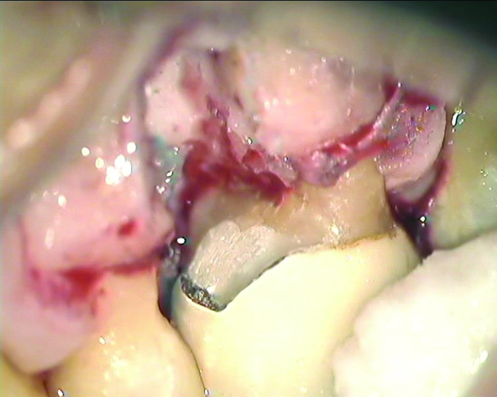 During the resection process, directly visualizing the smooth transition to the retained distobuccal and palatal roots is essential and made possible by utilizing an operating microscope. Note that in Figure 6 the underside of the tooth has been restored with a resin-modified glass-ionomer (RMGI) restorative material. The restoration of the underside of the remaining tooth is important to satisfy the objective of a maximally cleansable result. A new restoration to seal the underside of the cantilevered section of the tooth will almost always be needed, except in the few cases where the resection of the root and shaping of the cantilevered section results in the exposure of a perfectly smooth existing restoration with no voids. Most core buildups do not extend into the root canal orifices far enough to satisfy this condition, however, which is why placing a new restoration on the underside of the cantilevered portion should be planned in almost every case. An additional benefit of placing a new restoration that covers much of the cantilevered underside of the tooth is that the underside of the tooth will become more resistant to decay since the restorative material itself cannot directly decay.