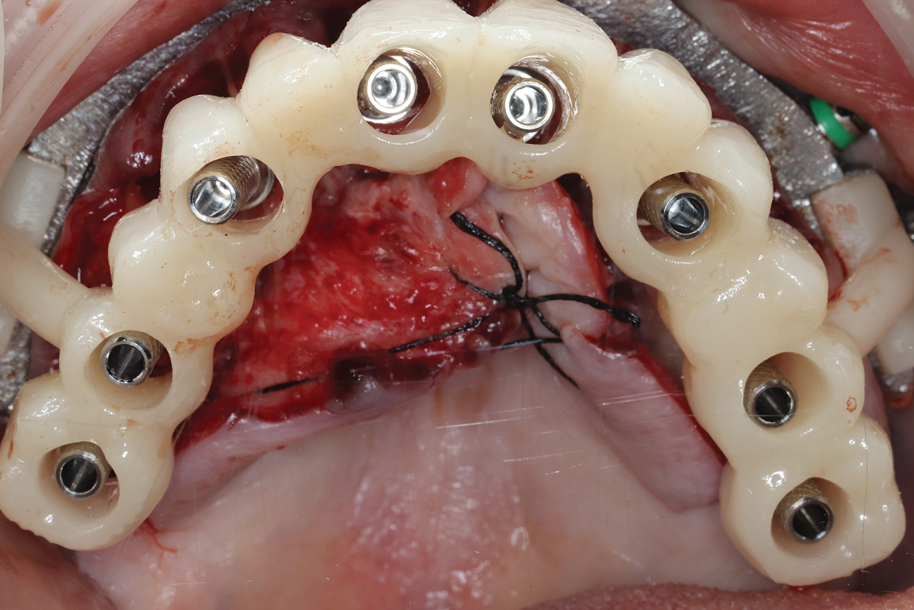 The challenges associated with intraoral scanning in full-arch dental implant procedures have profound clinical implications that extend beyond mere technical limitations. Inaccurate digital impressions can lead to misfitting implant restorations, which can result in complications such as soft-tissue inflammation, prosthesis fracture, bone loss, and implant failure (Figure 5 through Figure 7). The need for corrective procedures to address failures associated with inaccuracies can prolong treatment times as well as increase patients' discomfort and overall dissatisfaction. In addition, the financial implications of re-treatment cannot be overlooked because they may impose significant burdens on patients and practitioners alike. Inaccurate digital impressions may necessitate the fabrication of new restorations, additional surgical interventions, or modifications to the treatment plan-all of which can contribute to increased costs and treatment complexity as well as reduced patient satisfaction and confidence in the process. Patients who undergo full-arch dental implant procedures often have high expectations for the functional and esthetic outcomes of their restorations. Therefore, any discrepancies between the planned and actual results can lead to dissatisfaction and erode trust in the clinician's abilities.