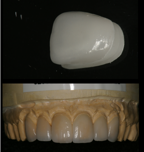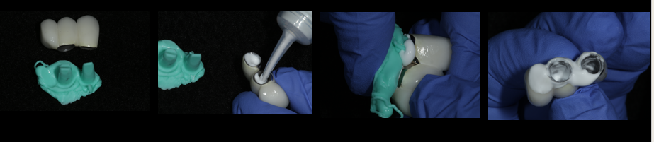 With indirect composite blocks, microabrasion should be performed after the try-in. After cleaning out the inside of the restoration, the clinician should apply the adhesive and light cure, or use silane or a priming agent that enhances adhesion between the indirect restorative material and the resin cement.