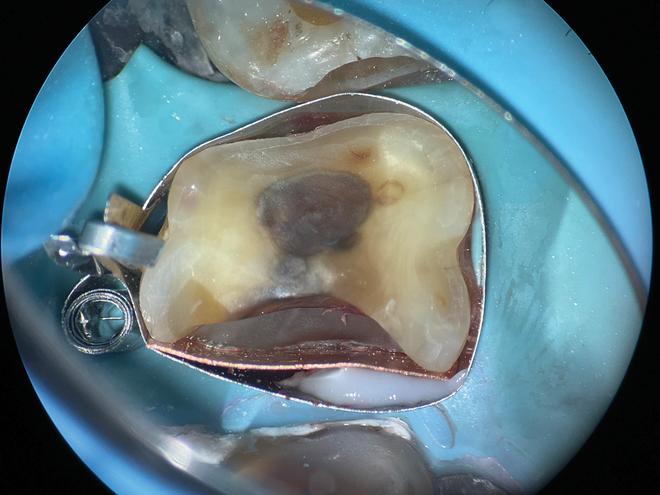 In cases involving extremely deep defects that extend to the bone level, achieving an adequate seal and proper isolation for adhesive procedures can be particularly challenging (Figure 10 and Figure 11). Oftentimes, a single matrix proves insufficient to reach the depth of such defects and effectively shield the cavity from contamination by saliva or blood (Figure 12).