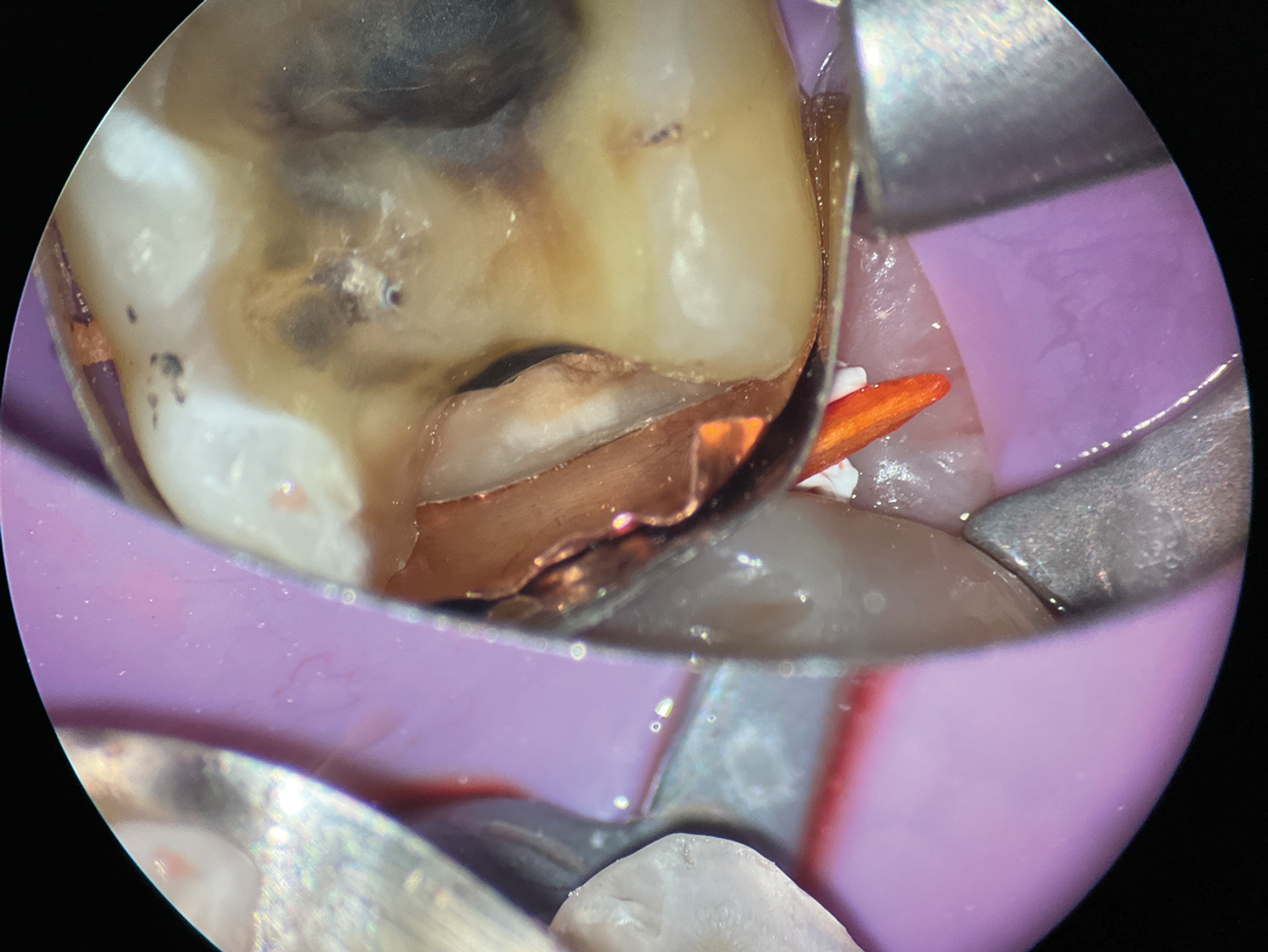 With its malleability and adaptability, a copper band offers an unparalleled solution for this purpose. It allows the practitioner to cut and shape the band to precisely match the unique structure of the canine fossa, accommodating variations in form and angles (Figure 4). Using a thicker copper band (ie, approximately 5 mil), provides the necessary strength to maintain stability during treatment. In addition, it effectively retracts the gingival tissue, which facilitates the placement and contouring of restorative materials, such as composite (Figure 5 and Figure 6).