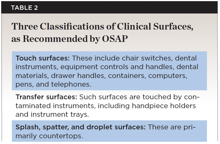 The Organization for Safety, Asepsis and Prevention (OSAP) recommends classifying clinical surfaces into three categories, as described in Table 2.5