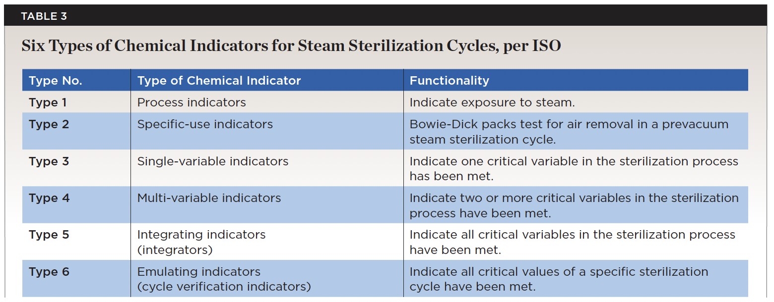 Chemical indicators are designed to respond to certain physical conditions inside the sterilizer chamber. The International Organization for Standardization (ISO) issues the standards for sterilization. The most current ISO standard recognizes six types of chemical indicators for steam sterilization cycles.12 These types of chemical indicators are listed in Table 3. Because chemical indicator test results are received when the sterilization cycle is complete, they can provide an early indication of a problem and where in the process the problem might exist.8
