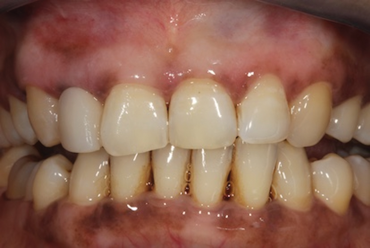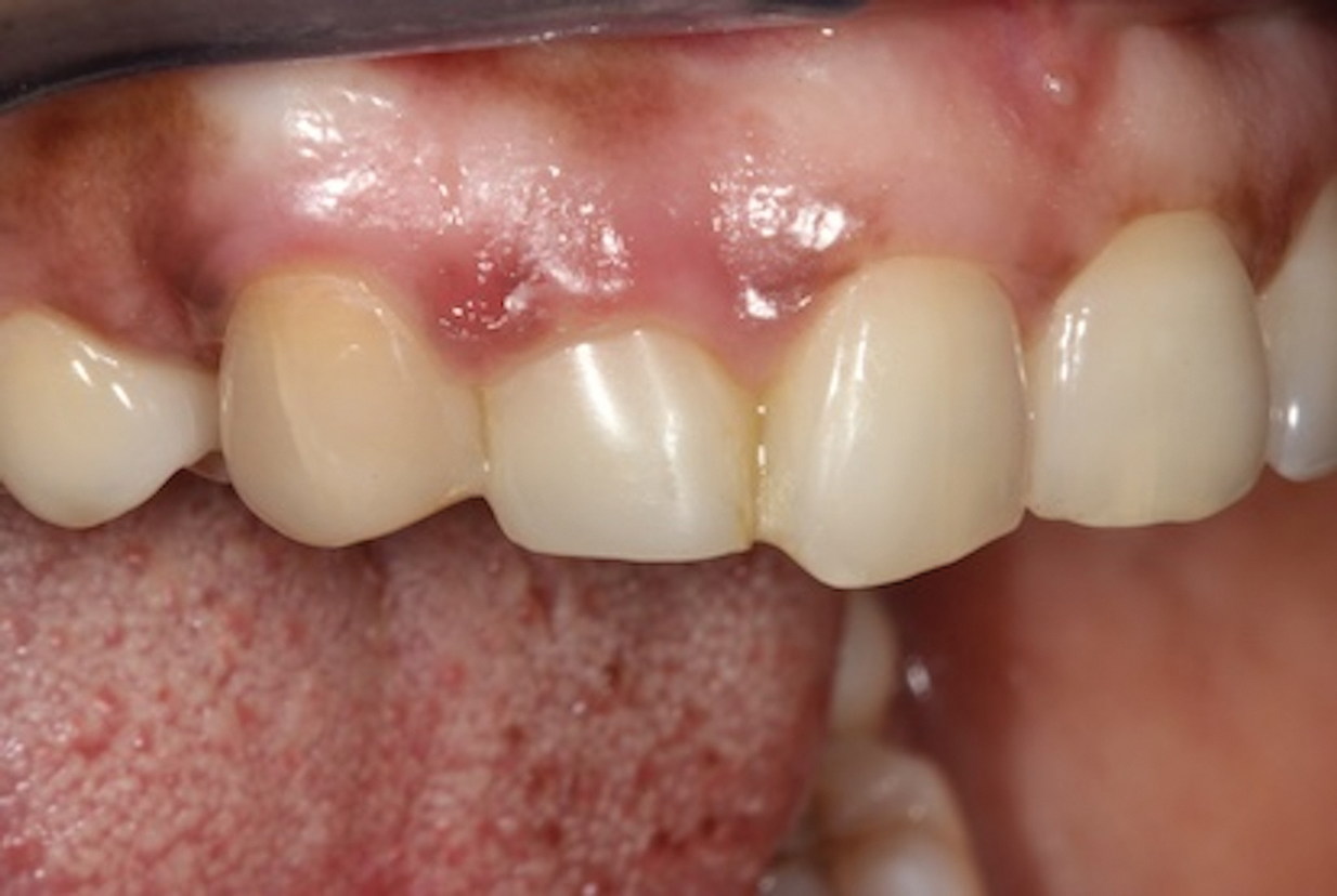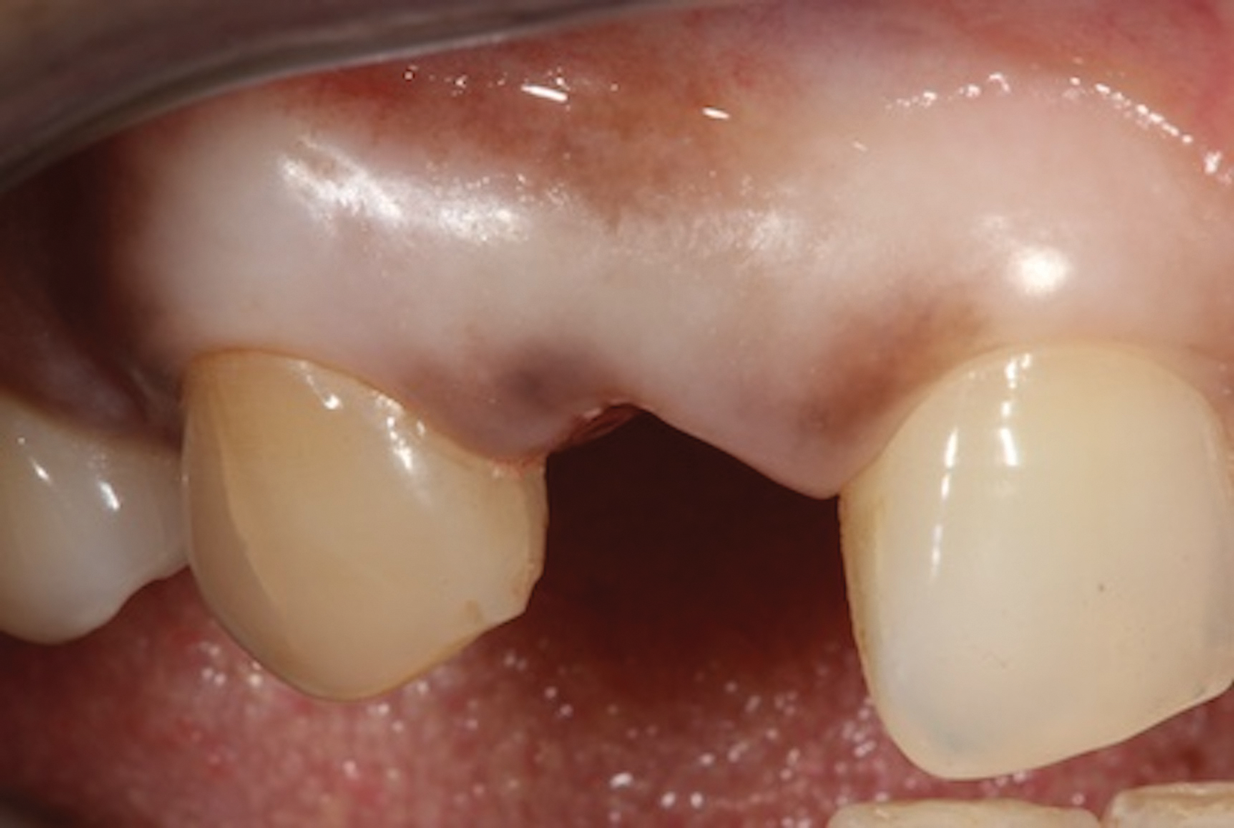 In the example case presented, the patient returned for evaluation 3 months after implant placement and delivery of the fiber-reinforced composite bridge, and the soft tissue at the site demonstrated adequate growth over the resin pontic (Figure 14). This would provide for a favorable esthetic outcome when the final implant-supported crown was ultimately delivered.