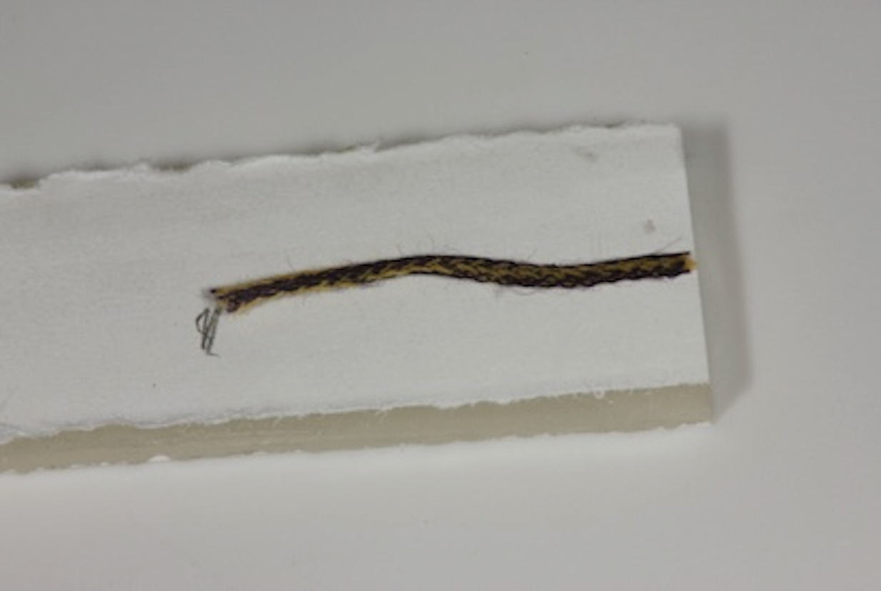 The fiber-reinforced composite bridge framework design presented here is comprised of a horizontal main fiber spanning the edentulous site to create the bridge scaffold and a vertical reinforcing fiber to support the pontic. The benefit of adding the vertical reinforcing fiber to the bridge framework is that it effectively halts crack development and propagation within the composite under loading conditions. To ensure that the length of the fiber is precise, premeasure the required length in the mouth using a piece of retraction cord. Extending the measuring cord for the horizontal fiber two-thirds of the way across the occlusal surfaces of the abutment teeth will permit sufficient area for bonding and facilitate enhanced fiber stability (Figure 4). Next, place the premeasured cord onto the packaged fiber reinforcement material (Figure 5), mark the length on the package, and cut, leaving the fiber inside the package. Follow this same procedure to cut a smaller portion for the vertical reinforcing fiber. Keep the fibers in their packaging until they are ready for bonding.