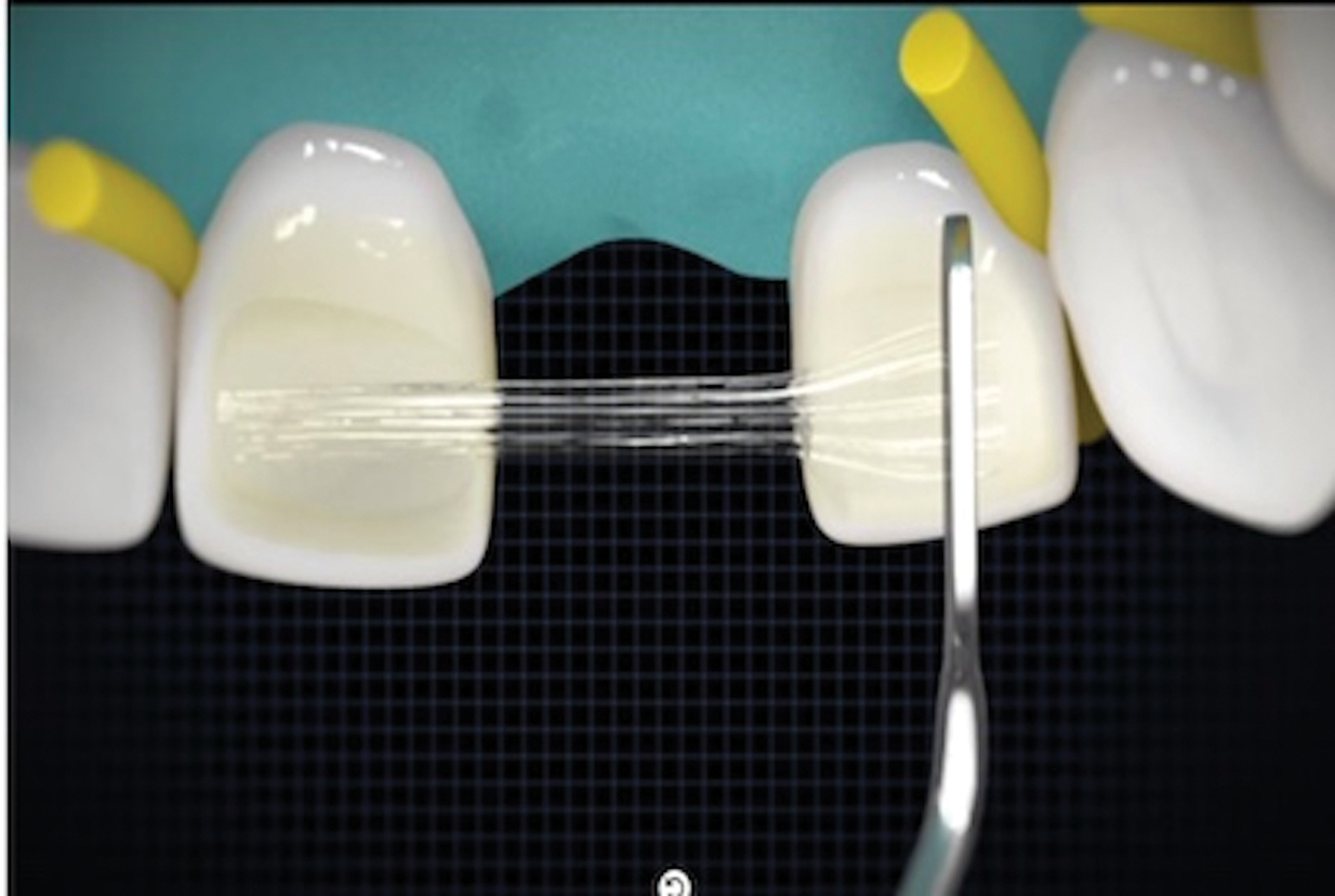 Creation of the fiber scaffold is initiated by bonding the main, horizontal length of fiber reinforcement material to one of the abutment teeth, and then, once stabilized, it is bonded to the other abutment tooth. The fiber reinforcement material should be bonded to the palatal surfaces of the teeth using a bonding agent and a light-cure flowable composite resin. When positioning the fiber reinforcement material on the teeth, it should be kept as incisal as possible to facilitate pontic development while ensuring adequate occlusal clearance. Press the fiber onto the tooth surface, and then, fan it out within the flowable resin (Figure 7). This will increase the surface area to maximize bonding effectiveness. Curve the fiber between the abutment teeth labially to provide space for the reinforcing transverse fiber and the layering composite. Retain the round structure of the fiber in the pontic area for maximum strength.