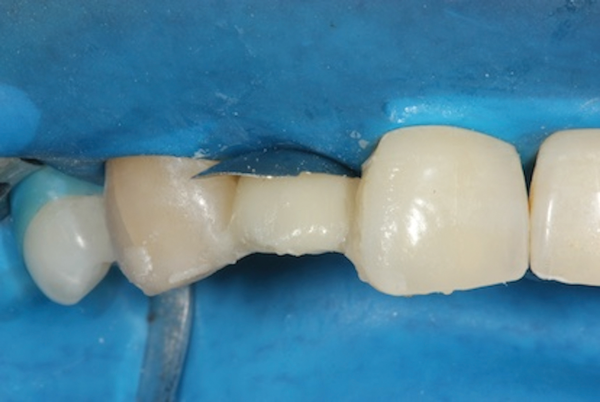 It should be emphasized that the successful delivery of fiber-reinforced composite bridges requires careful case selection and is technique sensitive. Risk factors that may impact the durability of fiber-reinforced composite bridges include the type of material used, the design of the bridge, the oral environment, and the patient's oral hygiene practices.6,9 The affordability of the technique could potentially broaden its use among patients who may not prioritize oral hygiene, and that could result in an increased risk of caries and periodontal diseases. In addition, certain occlusal issues, but particularly limited vertical space, pose a risk of damaging bonded bridges, which have specific interocclusal space parameters.9