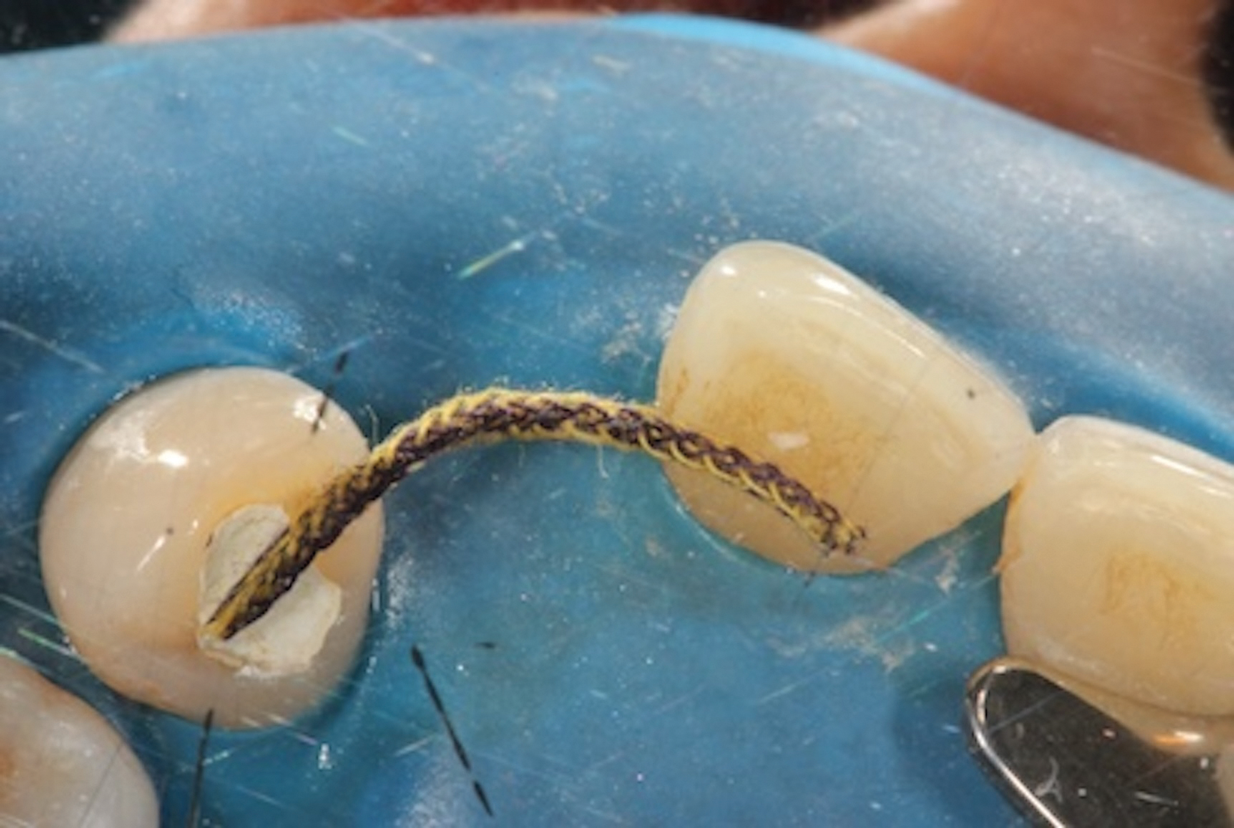 The fiber-reinforced composite bridge framework design presented here is comprised of a horizontal main fiber spanning the edentulous site to create the bridge scaffold and a vertical reinforcing fiber to support the pontic. The benefit of adding the vertical reinforcing fiber to the bridge framework is that it effectively halts crack development and propagation within the composite under loading conditions. To ensure that the length of the fiber is precise, premeasure the required length in the mouth using a piece of retraction cord. Extending the measuring cord for the horizontal fiber two-thirds of the way across the occlusal surfaces of the abutment teeth will permit sufficient area for bonding and facilitate enhanced fiber stability (Figure 4). Next, place the premeasured cord onto the packaged fiber reinforcement material (Figure 5), mark the length on the package, and cut, leaving the fiber inside the package. Follow this same procedure to cut a smaller portion for the vertical reinforcing fiber. Keep the fibers in their packaging until they are ready for bonding.