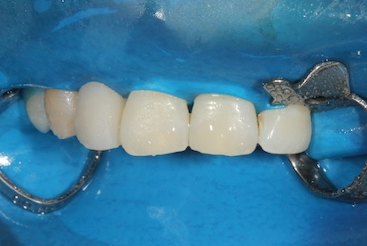 For any adhesive procedure, optimizing bond strength hinges on achieving proper isolation of the operating field. Placing a rubber dam ensures a pristine and fluid-free field, creating an ideal environment for both bonding and the subsequent development of the resin bridge (Figure 3). Achieving complete isolation is particularly important in cases involving replacement of a missing tooth immediately after extraction or implant placement.