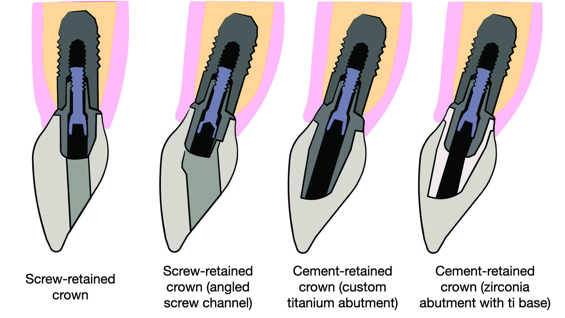 Selecting the optimal restoration method for anterior implants requires careful consideration of both functional and esthetic outcomes. While screw-retained crowns offer retrievability and minimize cement-related complications, cement-retained crowns with anodized titanium or zirconia abutments provide viable alternatives. Anodization of titanium abutments presents a practical strategy to improve esthetics, with gold hues enhancing ceramic crown color matching and pink hues better blending with soft tissue. Clinicians can optimize outcomes by tailoring ceramic thickness and anodization selectively, balancing technical feasibility with esthetic demands to achieve patient-satisfying results.