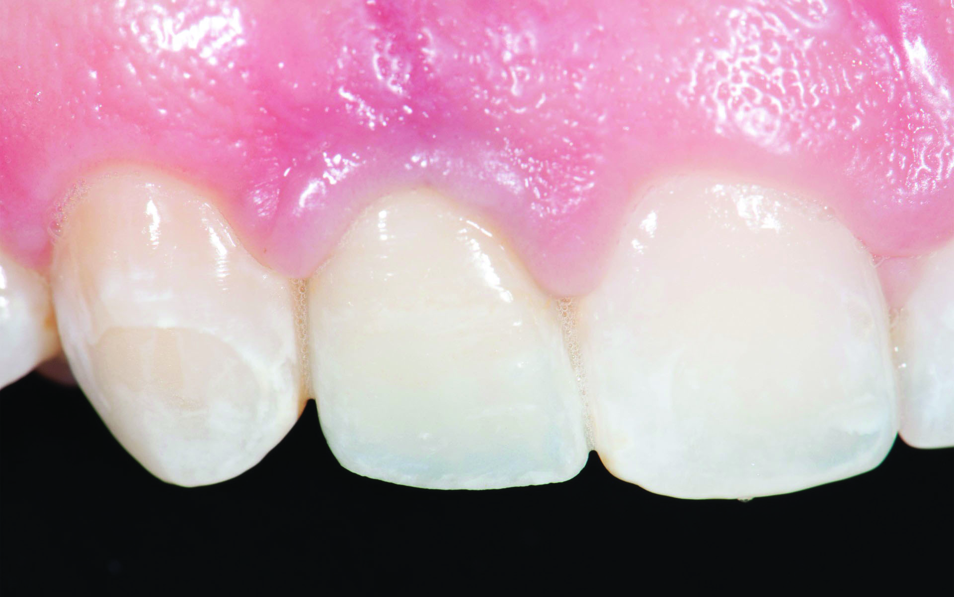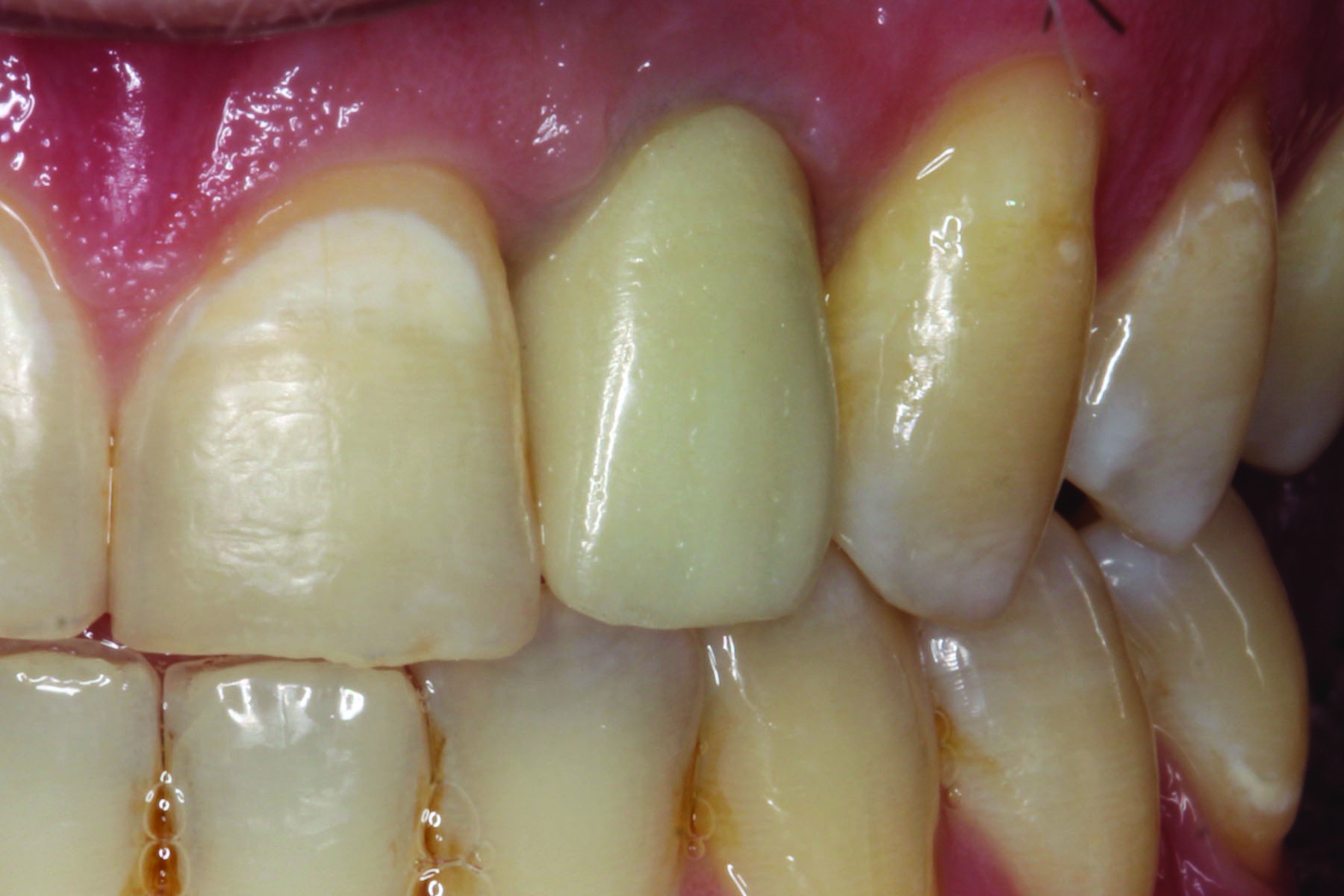 Titanium show-through of the gingival can also be an issue. Figure 2 demonstrates a titanium abutment that is visible through the soft tissue of an anterior implant restoration. Results of the aforementioned survey disclosed that 42% of clinicians place the abutment margins 1 mm subgingival and the remainder are placed 0.5 mm subgingival (33%) or equigingival (25%).1 Placing the margins deeper within the sulcus may help to hide the titanium; however, margins placed 1 mm and 3 mm subgingivally had about 12 times or 24 times more undetected excess cement, respectively, than equigingival margins.5