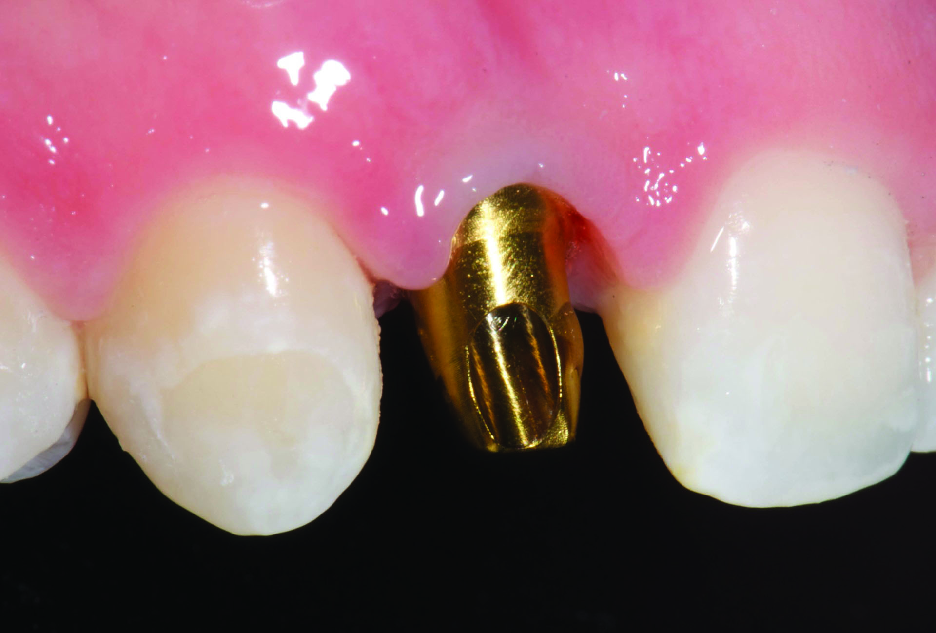Another study involved 25 patients with a missing maxillary tooth in the esthetic region and included 25 crowns on gray titanium, pink anodized titanium, and hybrid zirconia abutments. Color measurements of the soft tissue of the implant site and contralateral tooth were compared. The results showed that the hybrid zirconia abutments produced the least color difference, followed closely by the pink anodized titanium abutments. Gray titanium abutments had the greatest color difference.13 In yet another study of 40 patients, it was determined that changing abutments of provisional anterior crowns from gray to pink significantly improved the color of the peri-implant mucosa, making it more closely match the natural gingiva. This color change was particularly noticeable in patients with thin gingival biotypes.14 In summary, pink anodization of abutments can allow for a better match of surrounding soft tissue than unanodized titanium but not as good a match as zirconia abutments.