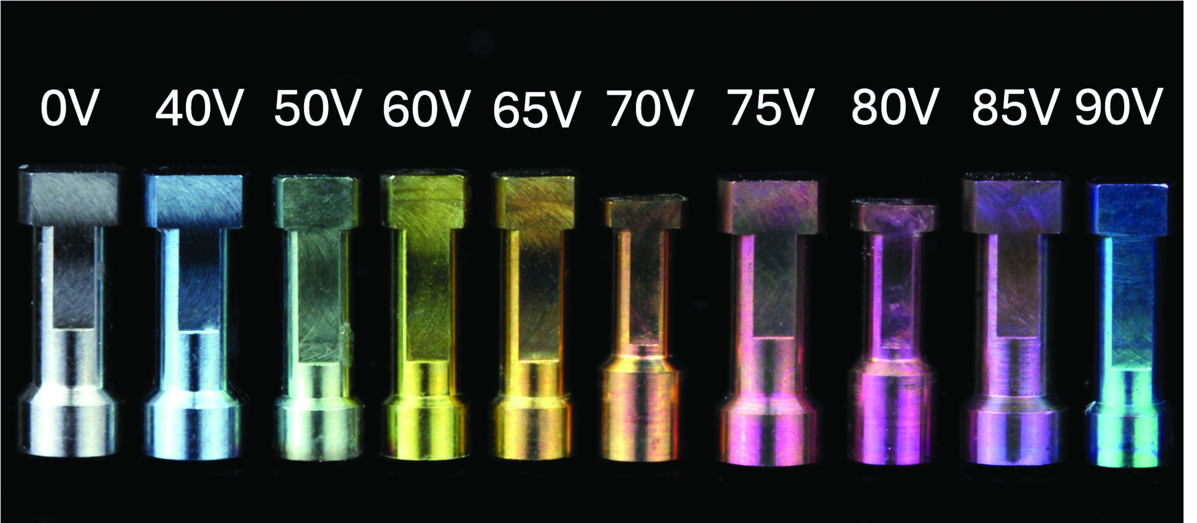 When using a TSP electrolytic solution, gold hue is achieved from 60V to 65V and pink hue is achieved from 70V to 80V.16 A color chart based on a TSP electrolytic solution is presented in Figure 6. When using 1M phosphoric acid solution, gold hues are achieved at 50V to 60V and pink hues at 65V to 70V.6