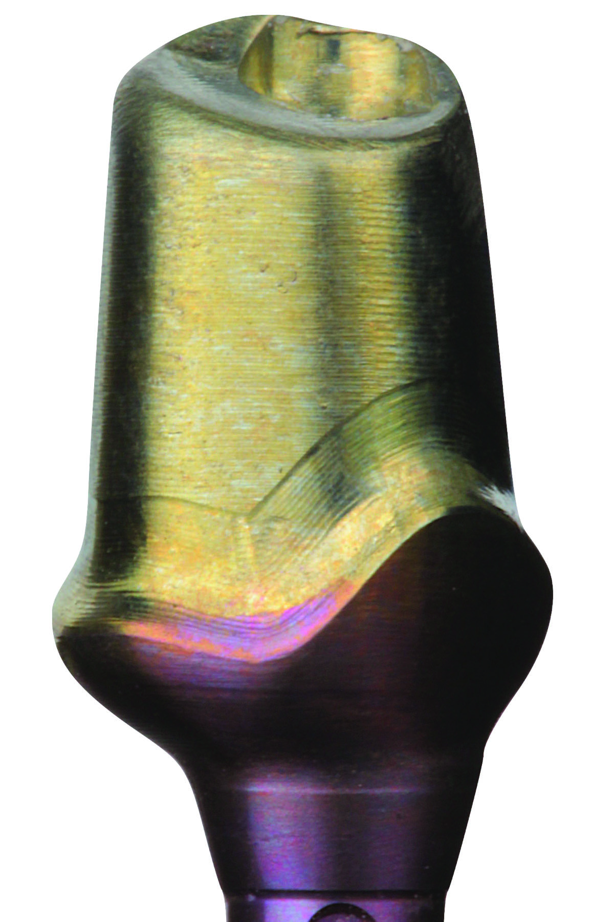 An implant part can always be subjected to an additional soaking at a higher voltage to further change the color of the part; however, dipping at a lower voltage will not return the part to an original color. Therefore, it is prudent to start at a low voltage and observe the achieved color change when first attempting this procedure. An implant part can also attain more than one color by being selectively dipped in the solution. For example, an abutment could be dipped in solution at 60V to 65V to obtain a gold hue, and then the subgingival component of the abutment could be dipped in solution at 75V to 80V to gain a pink hue (Figure 7).15