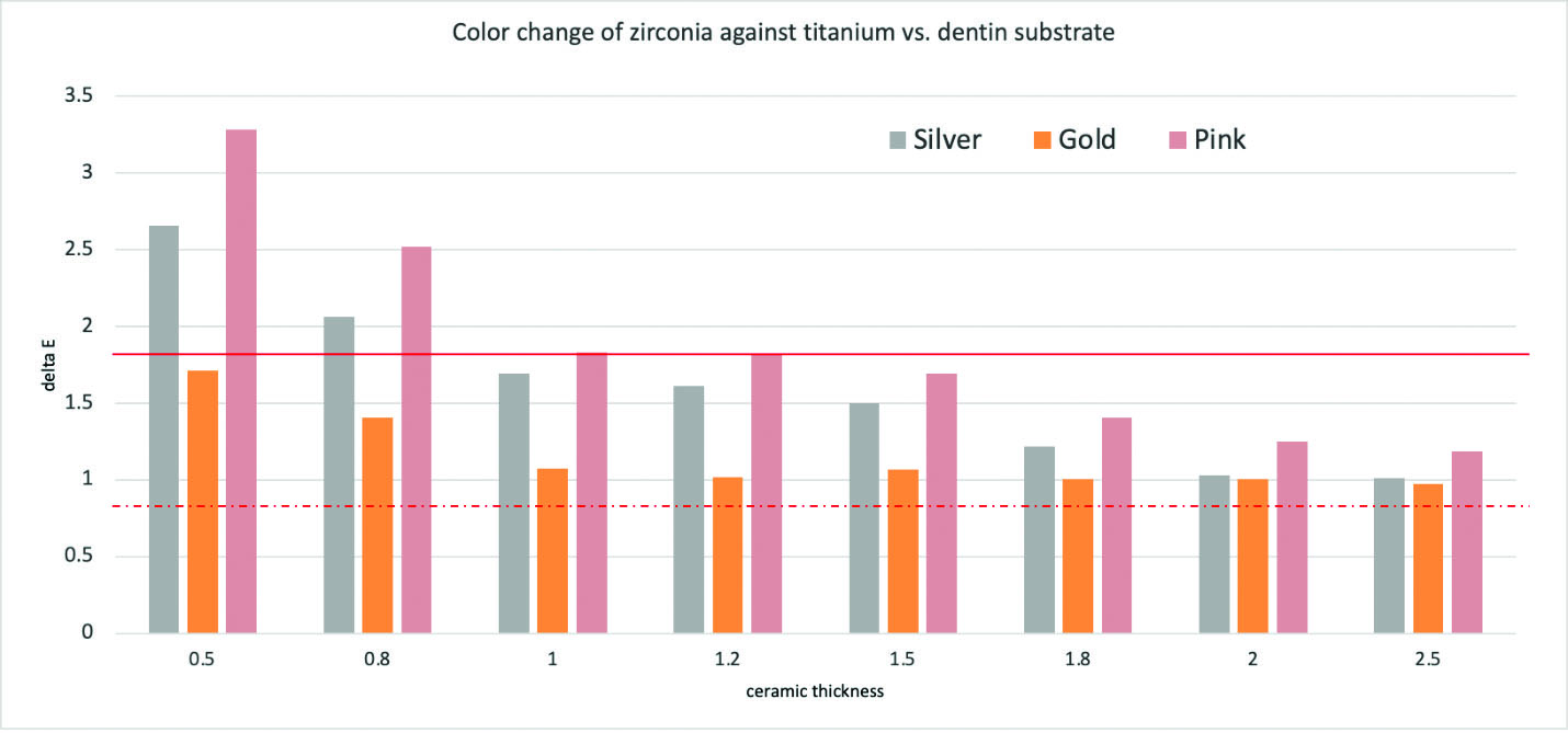 The results of this investigation are presented in Figure 9 and Figure 10 along with demarcations for the threshold of clinical perceptibility and acceptability. These results confirm the results of previous studies that gold anodization of titanium improves color match and pink anodization worsens color match for both lithium disilicate and zirconia. For lithium disilicate, the threshold of clinical acceptable color match with a dentin shade background could be achieved at 1 mm thickness for gold anodized titanium and 1.8 mm with unanodized titanium. This threshold could not be achieved with pink anodized titanium. For zirconia, the threshold of clinical acceptable color match with a dentin shade background could be achieved at 0.5 mm thickness for gold anodized titanium and 1 mm with unanodized titanium and pink anodized titanium.