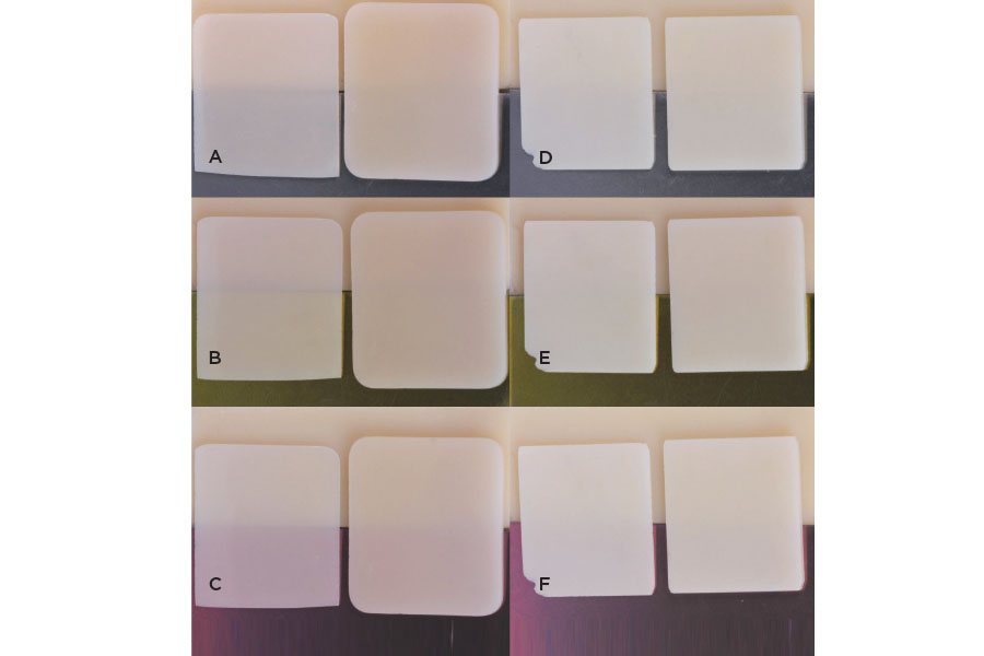 The ceramic tiles were placed over the titanium or dentin shade composite blocks without any intermediary medium (ie, cement). For each combination of ceramic tile (type of ceramic and thickness) and titanium (gold anodized, pink anodized, unanodized) or dentin shade composite block, L*, a*, and b* color values were recorded with a spectrophotometer. The difference in L*, a*, and b* color between each ceramic tile against the titanium blocks and their color against the dentin shade composite block was compared using the ΔE2000 formula. Representative tiles overlaying titanium and dentin shade composite blocks are shown in Figure 8.