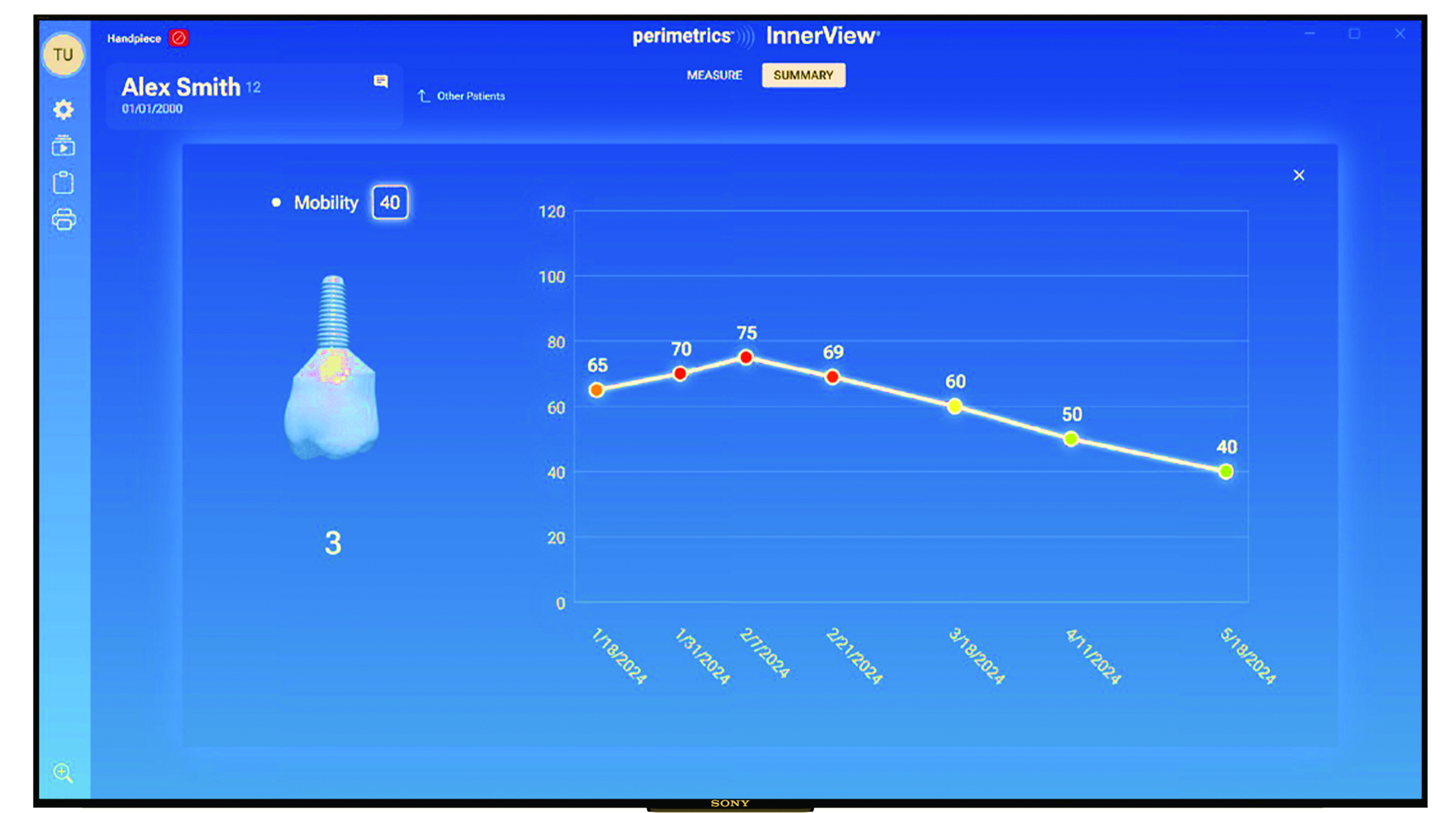 Currently, dental team members can utilize QPD to evaluate the stability of implants as it relates to their overall movement measured as micromobility. The less overall mobility in an implant, the more structurally stable the site is. When QPD is used to assess the health of implants after placement and at subsequent examinations and hygiene appointments, it facilitates the development of trend lines that indicate whether the site is becoming healthier or more compromised over time (Figure 6). This permits assessment of whether treatments have been successful or not using quantifiable data.