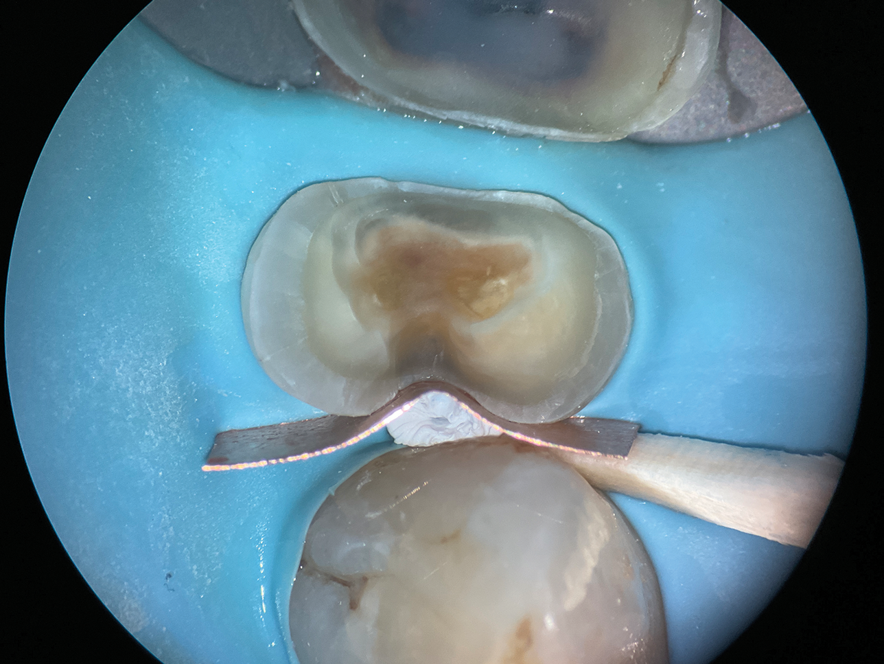 With its malleability and adaptability, a copper band offers an unparalleled solution for this purpose. It allows the practitioner to cut and shape the band to precisely match the unique structure of the canine fossa, accommodating variations in form and angles (Figure 4). Using a thicker copper band (ie, approximately 5 mil), provides the necessary strength to maintain stability during treatment. In addition, it effectively retracts the gingival tissue, which facilitates the placement and contouring of restorative materials, such as composite (Figure 5 and Figure 6).