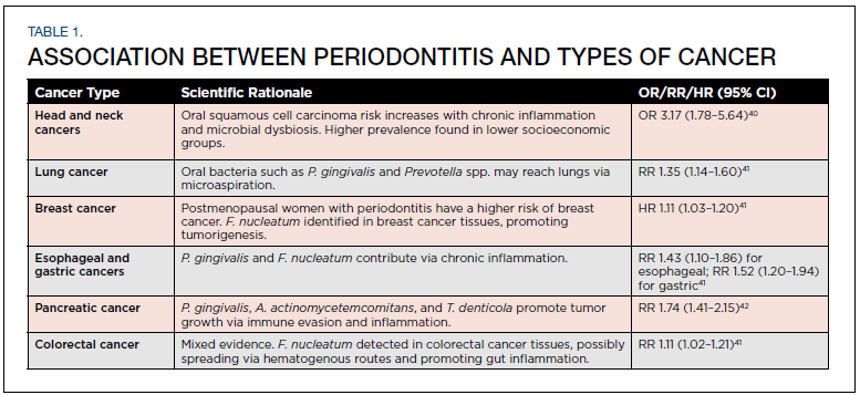 Research has linked periodontitis with the development of several different types of cancer, including head and neck cancers, lung cancer, breast cancer, esophageal and gastric cancers, pancreatic cancer, and colorectal cancer (Table 1).