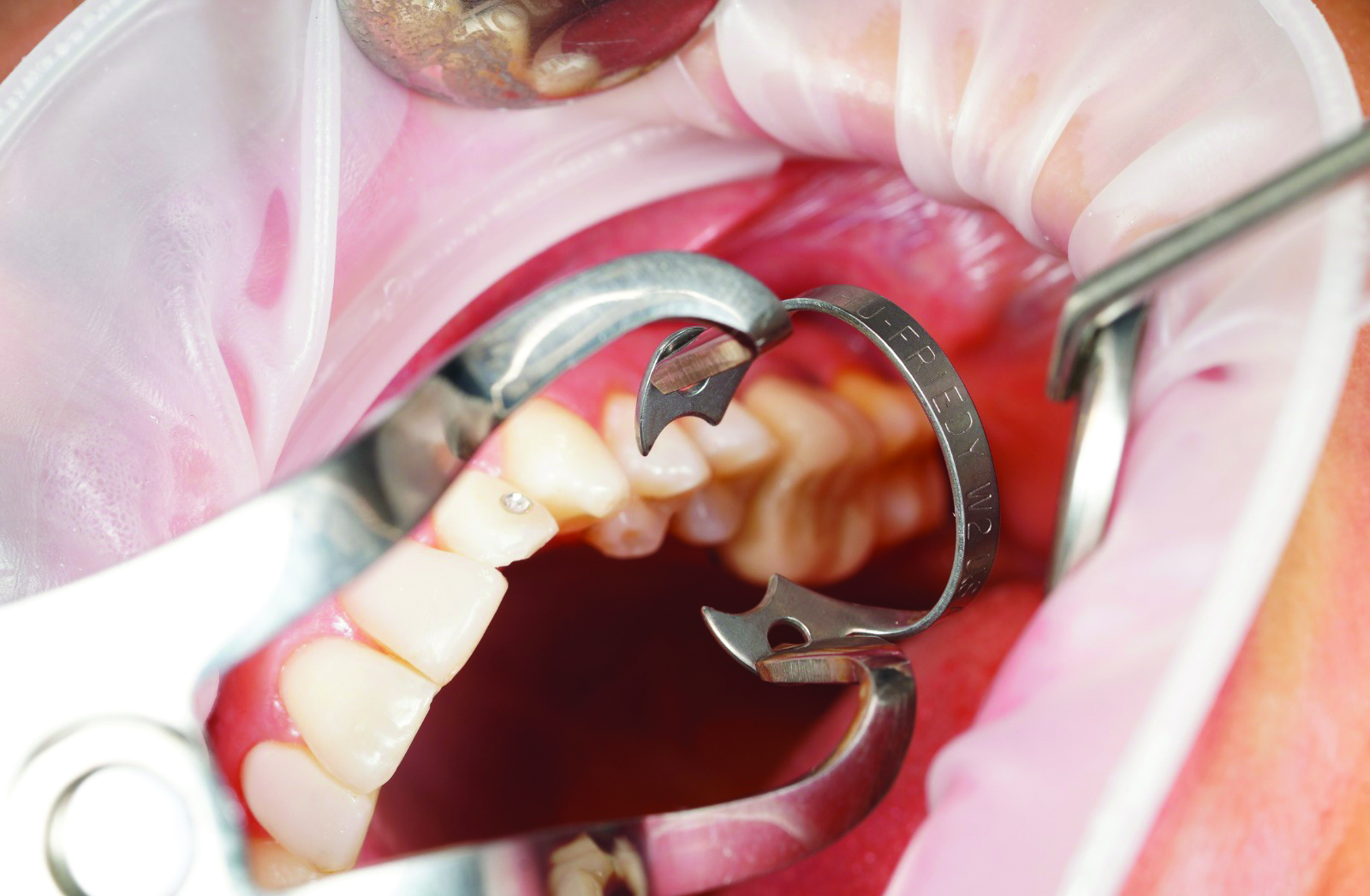 The second clinical step focuses on achieving effective and gapless isolation to ensure sustained stability. As in any isolation procedure, the rubber dam should be positioned beyond the contours of the tooth and inverted into the sulcus. The two-step rubber dam application under the DOM requires the use of four-handed dentistry to retract the cheek, thereby safeguarding the patient’s nasal and oral airways while the rubber dam sheet is stretched over the clamp.