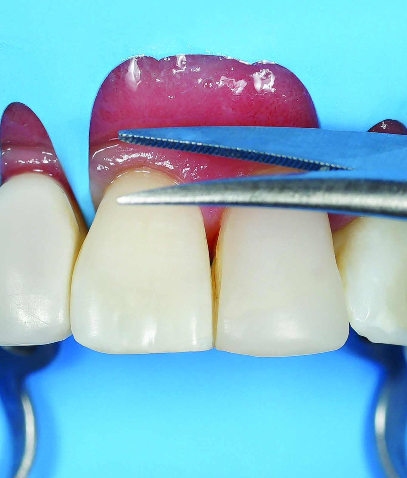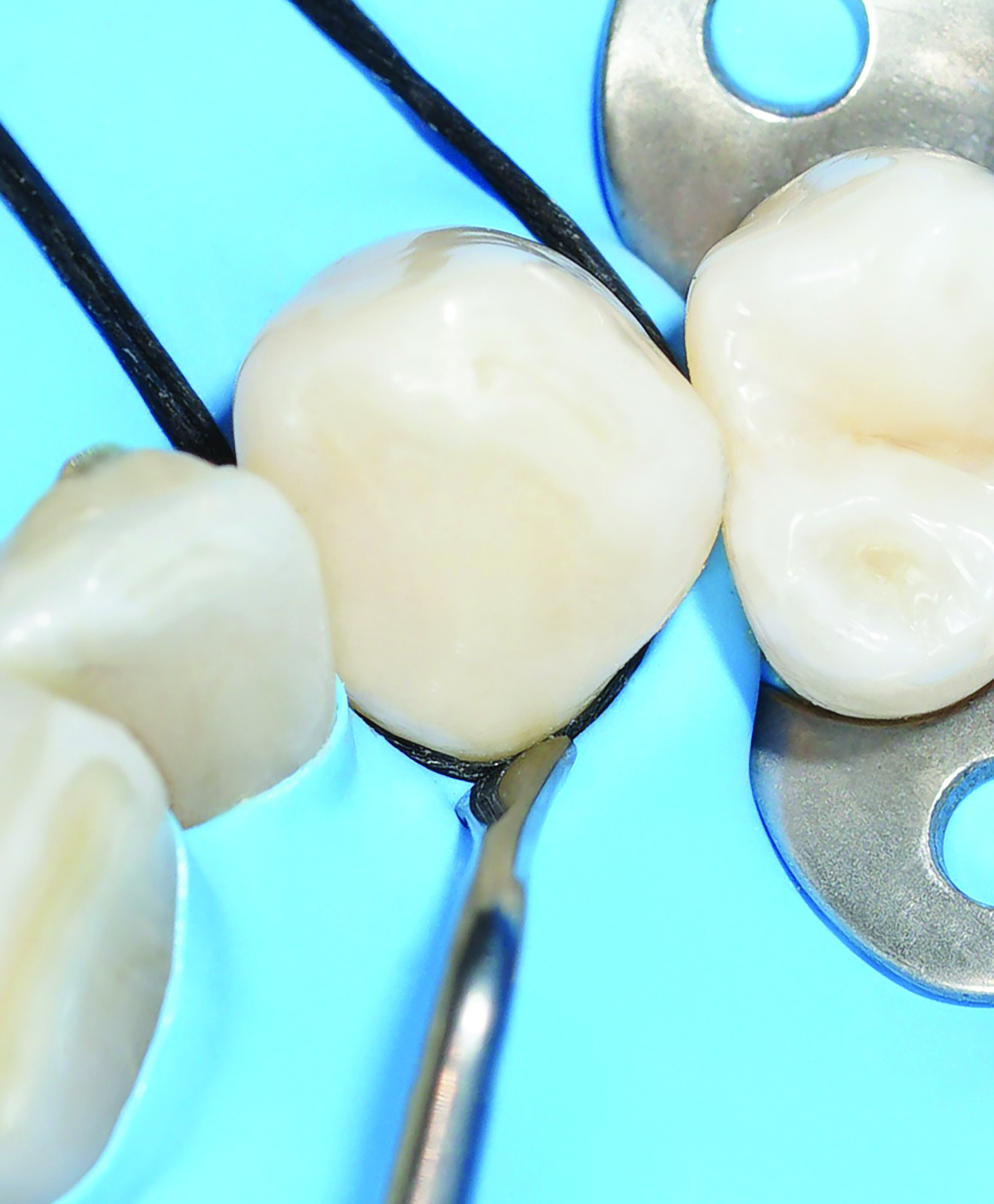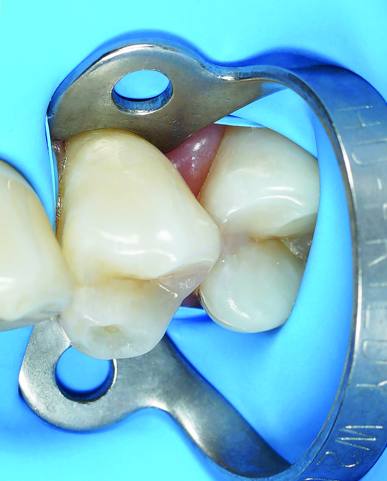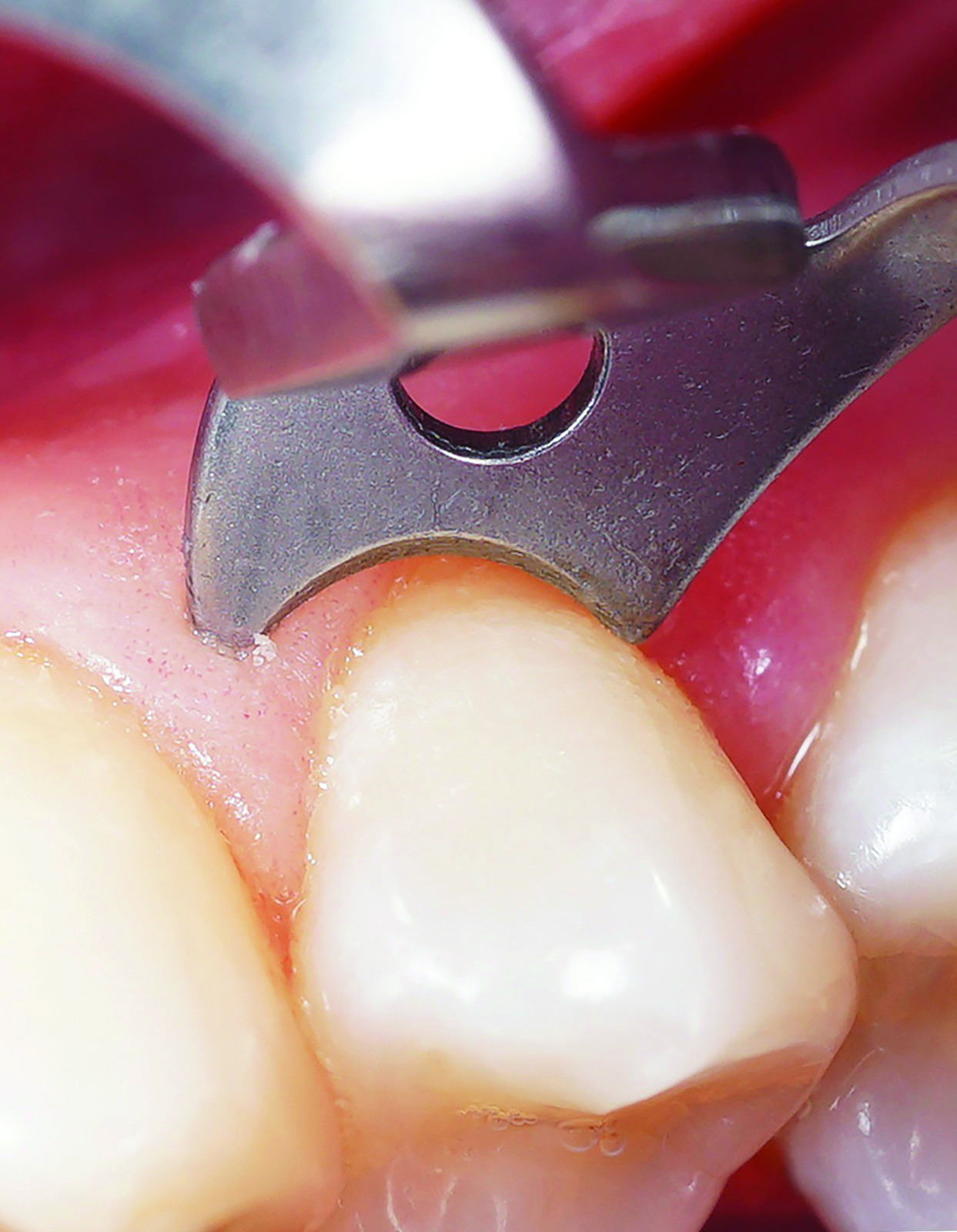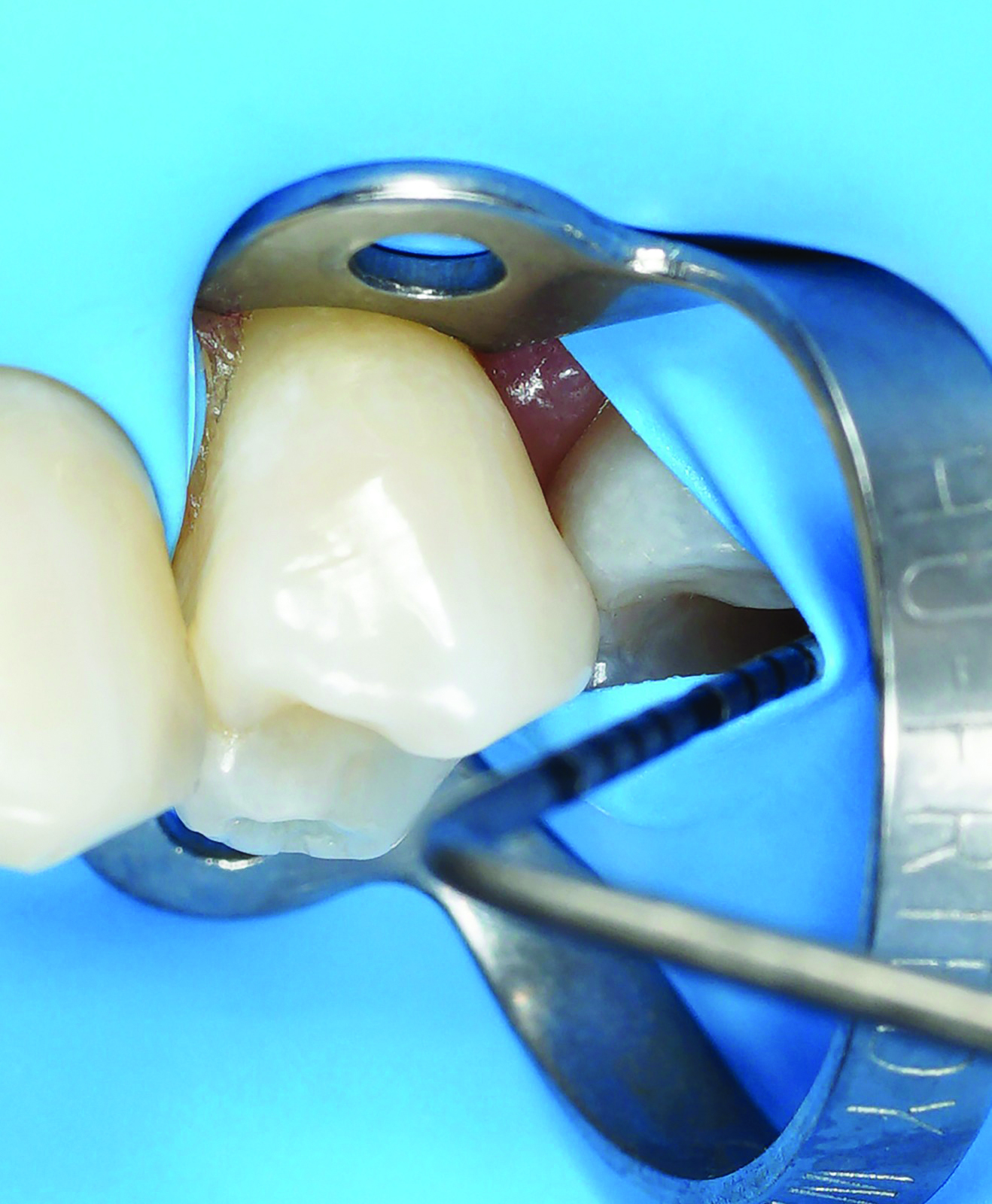 To fully cover the interdental papillae areas, particularly behind sitting clamps, a periodontal probe can be employed to mobilize the rubber dam sheet. A heavy-gauge dam is preferred for both latex and non-latex sheets, as this provides superior retraction of peripheral tissues, including the papillae.9 While passing a thin rubber dam interproximally may seem like a straightforward endeavor, the dam is more prone to tearing when tight or less-smooth contacts are being navigated.