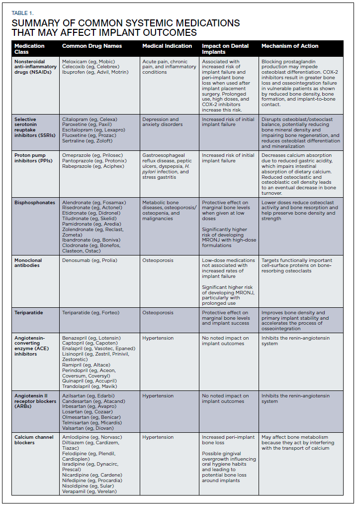 Although it has been estimated that the 10-year survival rate of dental implants is 96.4%,6 the rates of biologic and prosthetic complications are significant.7-10 Biologic implant complications include both peri-implant mucositis and peri-implantitis, and prosthetic implant complications include fracture of the restorative material, screw loosening, fracture of the screw, and fracture of the implant fixture. Implant survival and success rates are impacted by environmental and local factors. Systemic conditions such as diabetes mellitus, rheumatoid arthritis, smoking, and other chronic diseases result in a hyperinflammatory state, which can affect osseointegration early in healing and increase the risk of peri-implant disease. Furthermore, certain medications, such as nonsteroidal anti-inflammatory drugs (NSAIDs), selective serotonin reuptake inhibitors (SSRIs), proton pump inhibitors (PPIs), antiresorptive medications, and antihypertensive medications, can impact wound healing and/or bone metabolism and may influence implant success and survival (Table 1).11