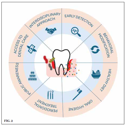 The early detection and management of periodontitis can offer significant public health benefits for oral and overall health, including in reducing the risk of certain cancers.56 Regular dental checkups can help prevent disease progression and reduce systemic inflammation linked to cancer. In addition, public health initiatives promoting oral hygiene, smoking cessation, and healthy diets can help to further lower the prevalence of periodontitis and its associated health risks, including cancer (Figure 2).57